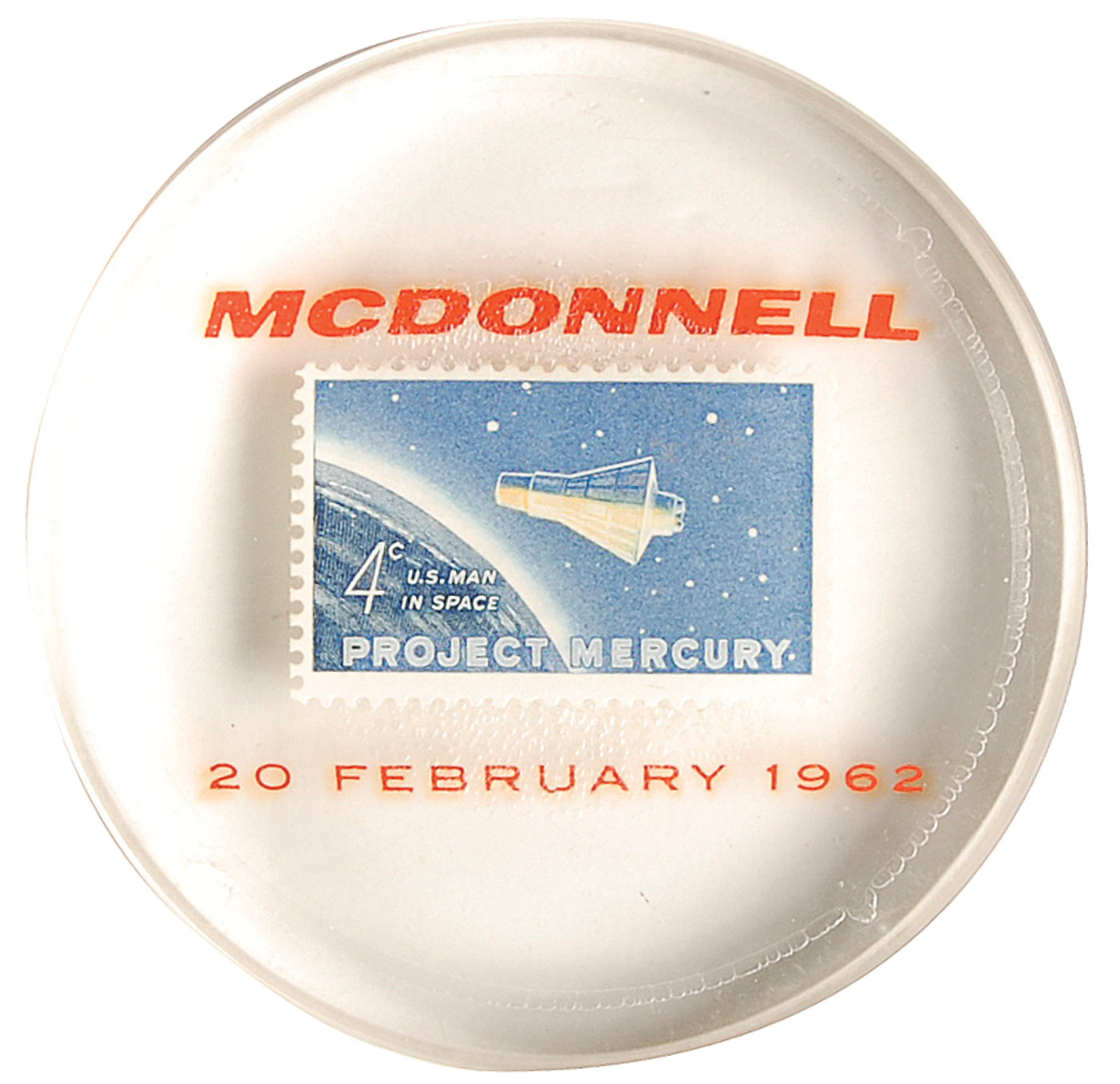 A single four-cent USPS Project Mercury postage stamp with “Issued on successful completion of 3 world orbits by Lt. Col. John H. Glenn, Jr.” Stamp is encased in a 3-inch diameter circular piece of Lucite, and reads, “McDonnell, 20 February 1962.”