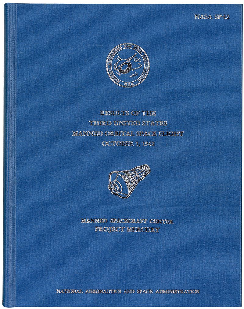Unsigned book: Results of the Third United States Manned Orbital Space Flight. Washington, DC: NASA, 1962. Hardcover, 8.25 x 10.5, 120 pages. Rare NASA publication SP-12 featuring charts and images from NASA’s third space flight on October 3, 1962. Bound in blue and bears silver lettering on the front cover with a NASA logo and image of a Mercury capsule, and the words “NASA Reference” on the reverse. In fine condition. Hardcover versions of these reports are rarely encountered.