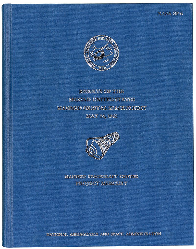 Unsigned book: Results of the Second United States Manned Orbital Space Flight. Washington, DC: NASA, 1962. Hardcover, 8.25 x 10.5, 107 pages. Rare NASA publication SP-6 featuring charts and images from NASA’s second space flight on May 24, 1962. Bound in blue and bears silver lettering on the front cover with a NASA logo and image of a Mercury capsule, and the words “NASA Reference” on the reverse. In fine condition. Hardcover versions of these reports are rarely encountered.