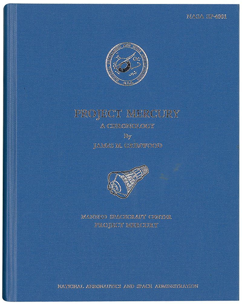 Unsigned book: Project Mercury: A Chronology by James M. Grimwood. Washington, DC: NASA, 1963. Hardcover, 8.5 x 10.5, 238 pages. Rare NASA publication SP-4001 featuring a history and images of the Mercury program. Bound in blue with silver lettering, a NASA logo, and an image of a Mercury capsule on the front, and the words “NASA Reference” on the reverse. In fine condition, with some light soiling to cover. Hardcover versions of these reports are rarely encountered.