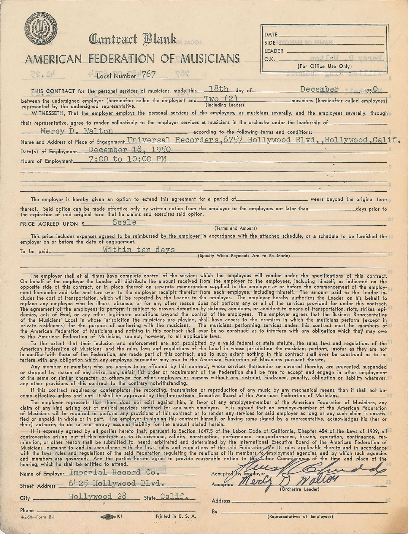 American jump blues pianist, singer and songwriter (1915–1962), whose compositions went from blues to R&B numbers; he had a national hit on Specialty Records with 'One Room Country Shack,' now considered a blues standard, and toured with the jump blues band of Big Jay McNeely. DS, signed “Mercy D. Walton,” one page, 8.5 x 11, December 18, 1950. American federation of Musicians contract in which Walton agrees to a three-hour recording session at Hollywood's Universal Recorders on the same day. Signed at the conclusion in black ink by Walton. In fine condition.