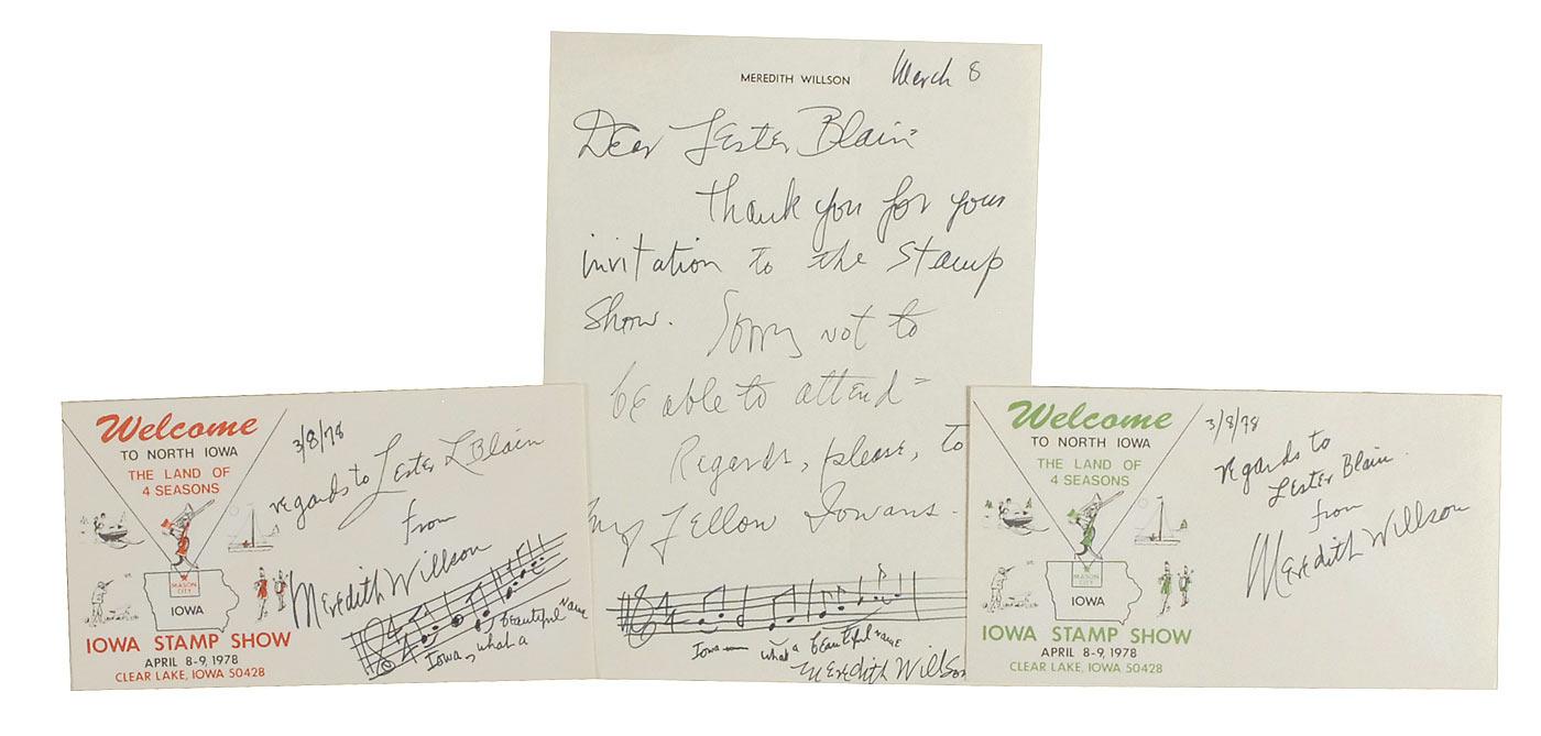 Composer, songwriter, conductor, and playwright (1902–1984) best known for writing the book, music and lyrics for the hit Broadway musical The Music Man, which won the Tony Award for Best Musical in 1958. Three items: ALS, one page, dated March 8, declining an invitation to a stamp show. In part: “Sorry not to be able to attend. Regards, please to my fellow Iowans.” At the bottom, Wilson adds a two-bar AMQS and lyrics to ‘Iowa, It’s a Beautiful Name’; and two commemorative covers from the 1978 Iowa Stamp Show, each signed and inscribed in black felt tip by Wilson, adding two bars of music and lyrics to ‘Iowa, It’s a Beautiful Name.’ In fine overall condition.