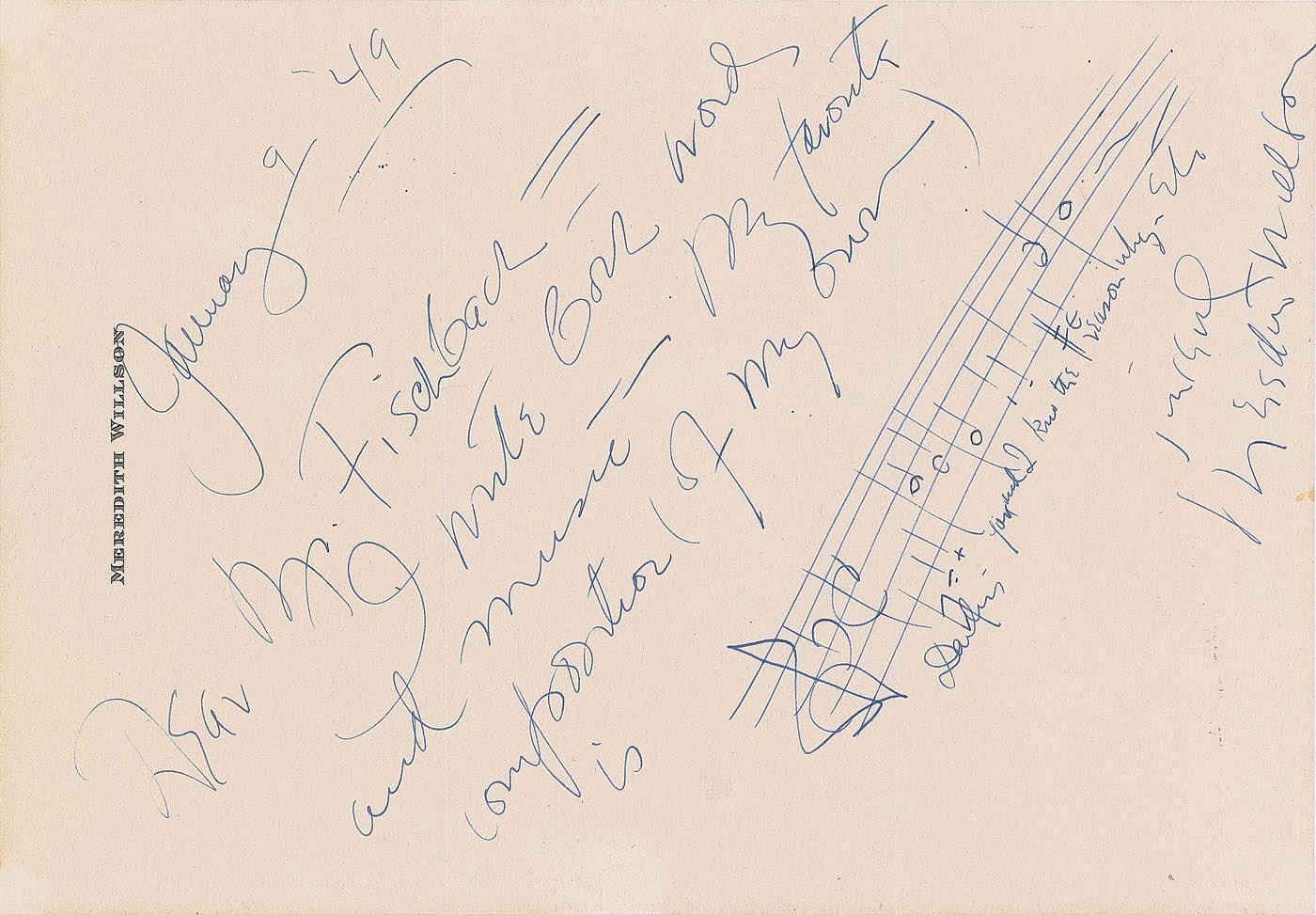 ANS, one page, 7.25 x 10.5, personal letterhead, January 9, 1949. Brief note to Mr. Fischbach, in full: "I write both word and music—my favorite composition of my own is," with Willson adding a five bar musical quotation from his popular song 'You and I,' with included lyrics: "Darling—you and I know the reason why." In fine condition.