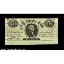Meredosia, IL- J.B. Carver & Co. 5ó Nov. 1, 1863A great piece of scrip from this small community. We have seen no other scrip from either this issuer or this location. Extremely Fine-About Uncirculated. Important notice: We expect to be auctioning lots at the rate of 200-250 per hour. Sometimes eBay Premier live bid software cannot keep up with that pace, so we strongly recommend that you place a realistic proxy bid now as insurance to avoid disappointment. Also please note that all Heritage/CAA lots purchased through eBay Premier carry a 20% Buyer's Premium. Please make sure you read the Terms and Conditions.