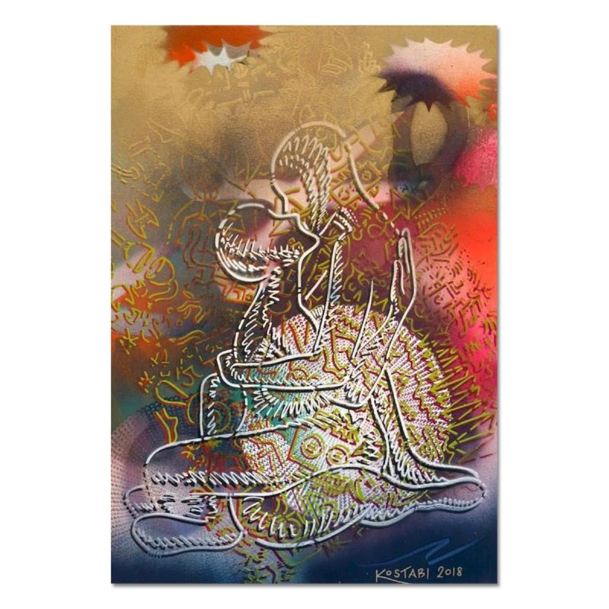 Merging Now And Forever by Kostabi Original. "Merging Now And Forever" is an original mixed media painting on paper by Mark Kostabi. The piece is hand signed and accompanied by a Certificate of Authenticity. Measures approximately 42 x 29.5".
