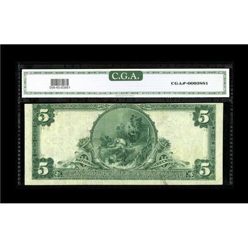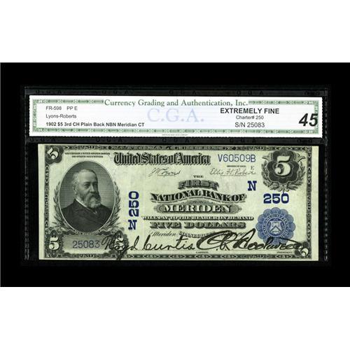 <B>Meriden, CT</B></I> - $5 1902 Plain Back Fr. 598 <B>The First NB</B></I> Ch. # (N)250<BR><B>CGA Extremely Fine 45.</B></I> A bright note that would be ideal as a representative of its type in any collection.<BR><BR><b>Shipping:</b> Coin/Currency (<a target="_blank" href="http://www.heritageauctions.com/common/shipping.php">view shipping information</a>)
