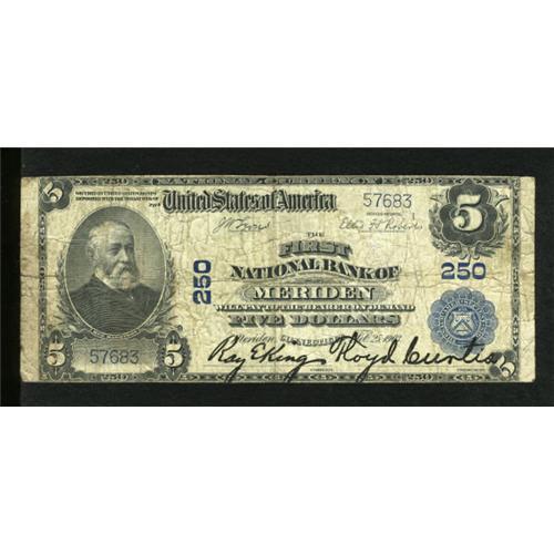<B>Meriden, CT</B></I> - $5 1902 Plain Back Fr. 598 <B>The First NB</B></I> Ch. # 250<BR> This $5 has paper snap and the signatures were printed very dark. In January 2007 we sold a similar graded $10 on this bank for over $425. <B>Very Good-Fine</B></I>.<BR><BR><b>Shipping:</b> Coins & Currency (<a target="_blank" href="http://www.heritageauctions.com/common/shipping.php">view shipping information</a>)