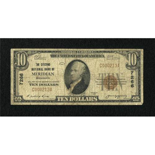 <B>Meridian, MS</B></I> - $10 1929 Ty. 1 <B>The Citizens NB</B></I> Ch. # 7266<BR> This <B>Very Good</B></I> note comes from a community very much identified with the Civil Rights Movement during the 1960's. <BR><I>From The Kansas City Collection</B></I><BR><BR><b>Shipping:</b> Coins & Currency (<a target="_blank" href="http://www.heritageauctions.com/common/shipping.php">view shipping information</a>)