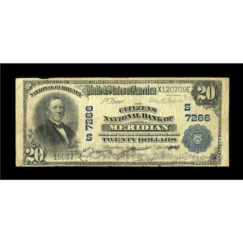 <B>Meridian, MS</B></I> - $20 1902 Plain Back Fr. 650 <B>The Citizens NB</B></I> Ch. # (S)7266<BR>We can't find a record of a $20 1902 Plain Back on this charter number being sold at auction. This example has dark stamped signatures of C.L. Hughes and Paney Brown. In fact the signatures are so dark that a large amount of black ink bleeds through on to the back. This community was originally named by settlers in the 1850s who mistakenly thought the word "meridian" meant "junction." <B>Fine.</B></I><BR><BR><b>Shipping:</b> Coins & Currency (<a target="_blank" href="http://www.heritageauctions.com/common/shipping.php">view shipping information</a>)