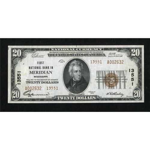 <B>Meridian, MS</B></I> - $20 1929 Ty. 2 <B>First NB</B></I> Ch. # 13551<BR> Broad margins and dark inks are merits of this $20. <B>Very Fine+.</B></I><BR><BR><b>Shipping:</b> Coins & Currency (<a target="_blank" href="http://www.heritageauctions.com/common/shipping.php">view shipping information</a>)