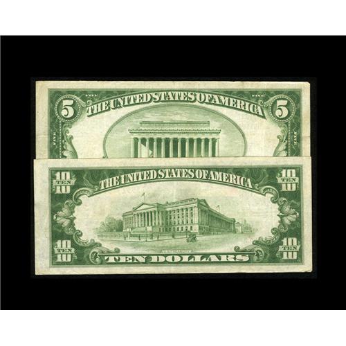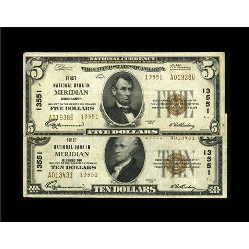 <B>Meridian, MS</B></I> - $5 & $10 1929 Ty. 2 <B>First NB</B></I> Ch. # 13551<BR>This evenly matched pair has excellent color and crisp paper quality. Both examples are <B>Very Fine-Extremely Fine.</B></I>