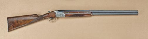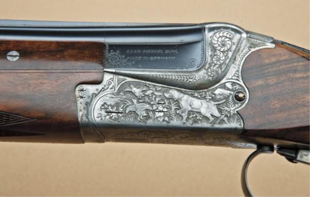 Merkel 16ga over/under shotgun, 27-7/8” barrel, hand filed raised rib, single trigger, auto ejectors, English style straight stock, select checkered burl walnut, hard-rubber butt. Nicely engraved action and game scenes, cocking indicators, split forend, serial #278163. The rifle remains in fine to near excellent condition showing 98% plus original blue. Frame shows light grey with just some slight staining. The stocks are fine to near excellent with just some crisp checkering. The stock shows most original finish. The gun shows just a little use but no abuse and bright bores. The stock measures 14-7/8” to the end of the wood, 15-1/8” to the end of the pad and would fit a tall man. A very attractive and nicely stocked Merkel. Est: $2,250 - $4,500