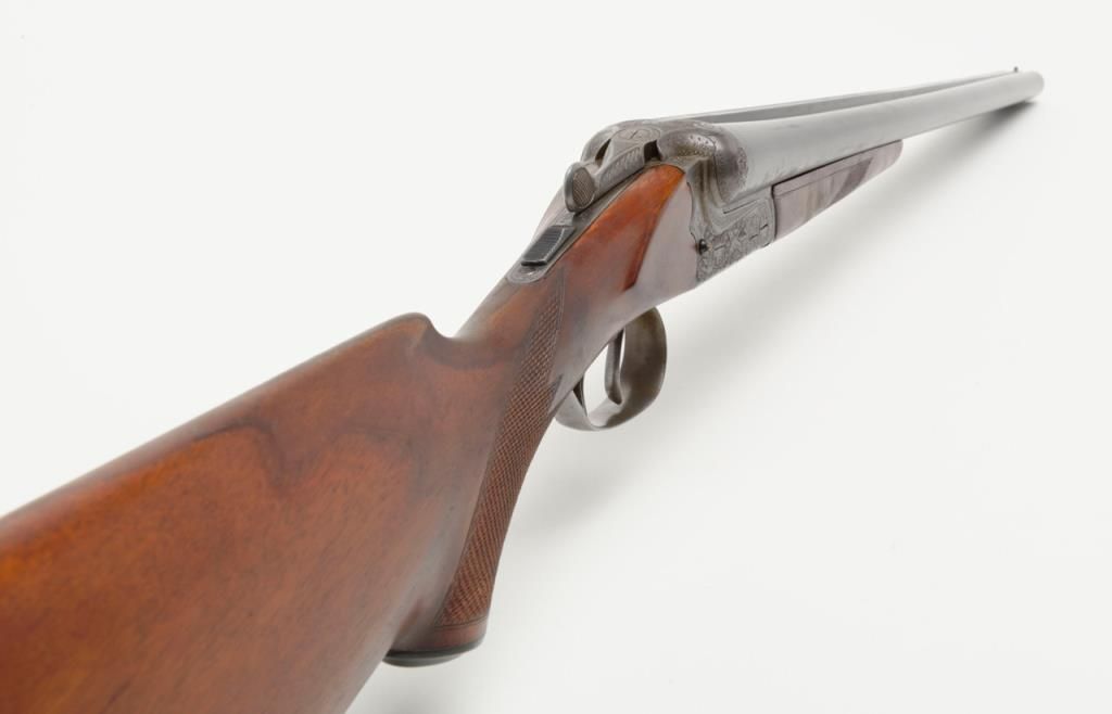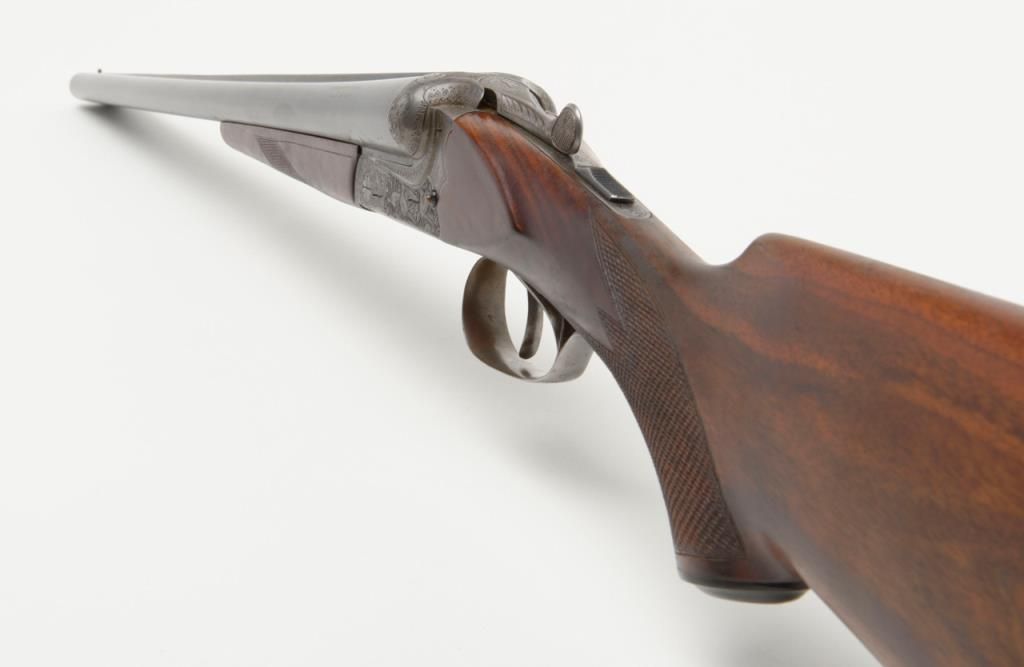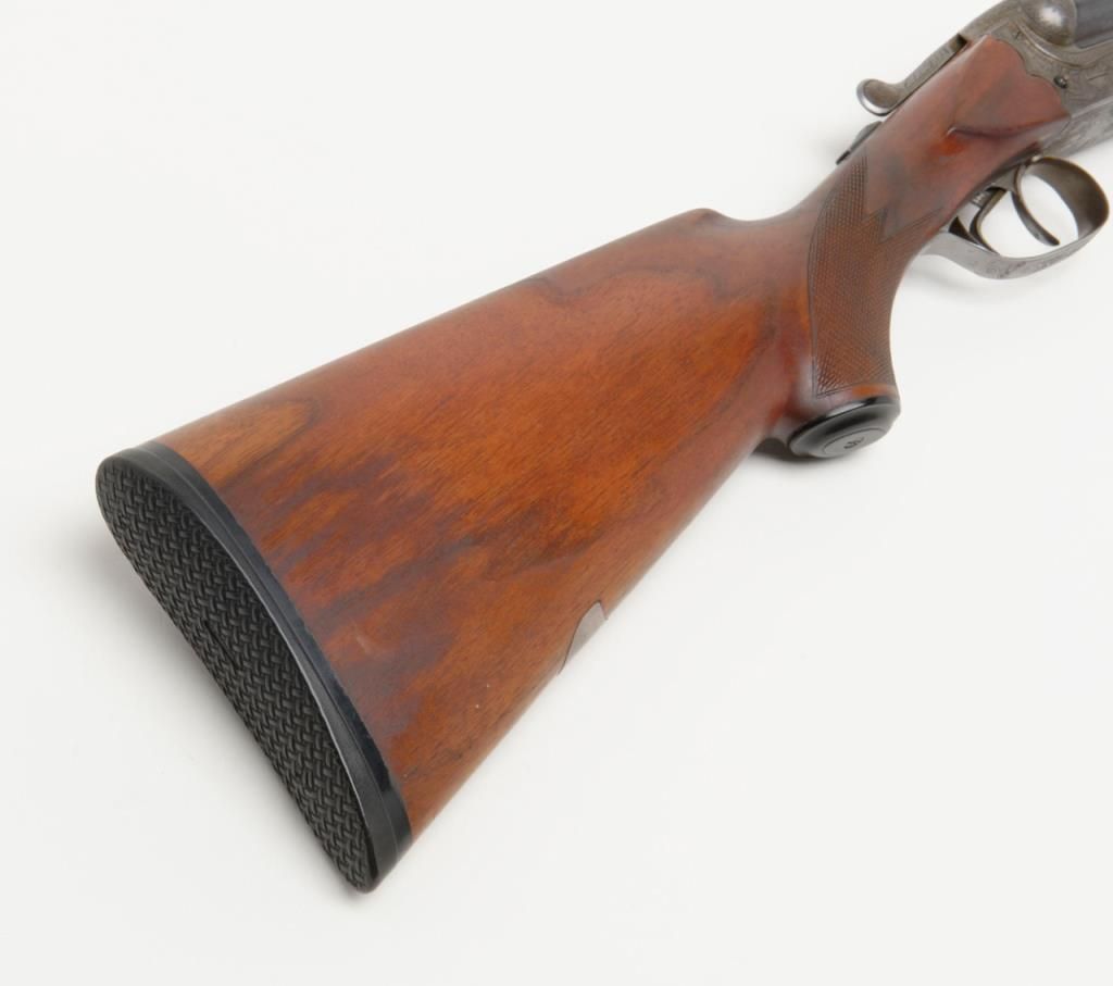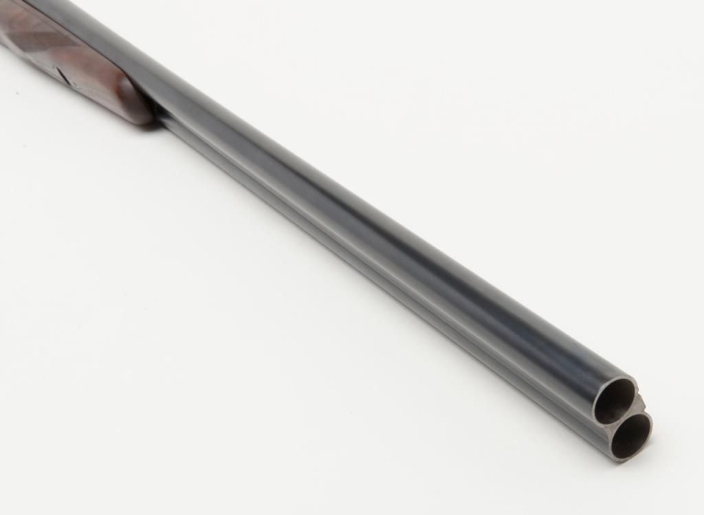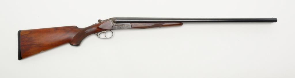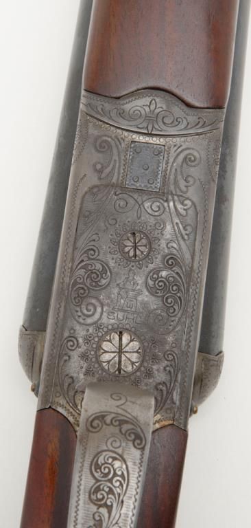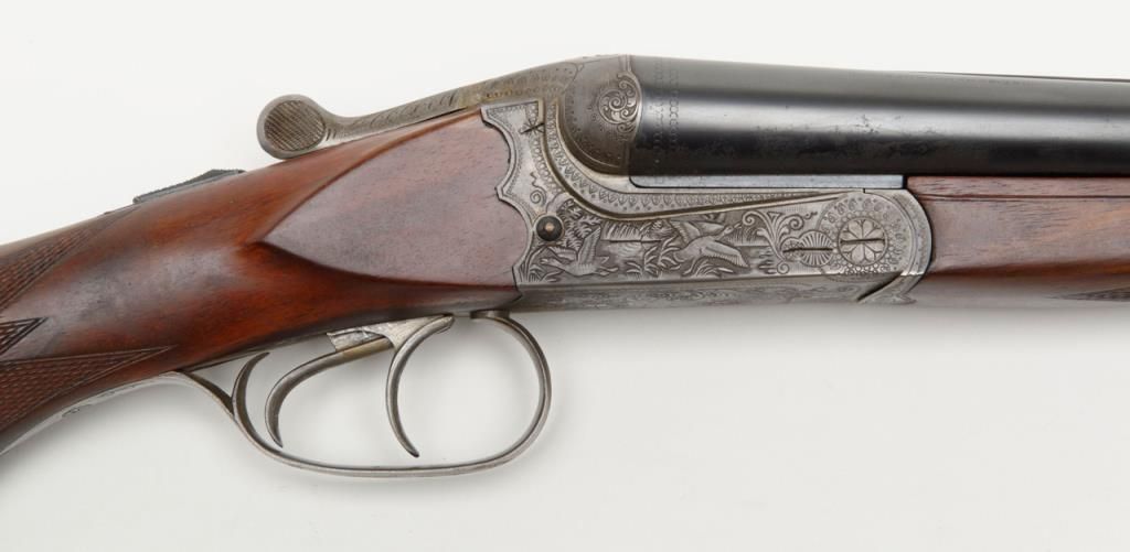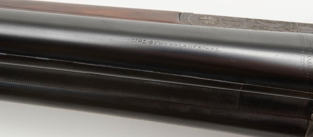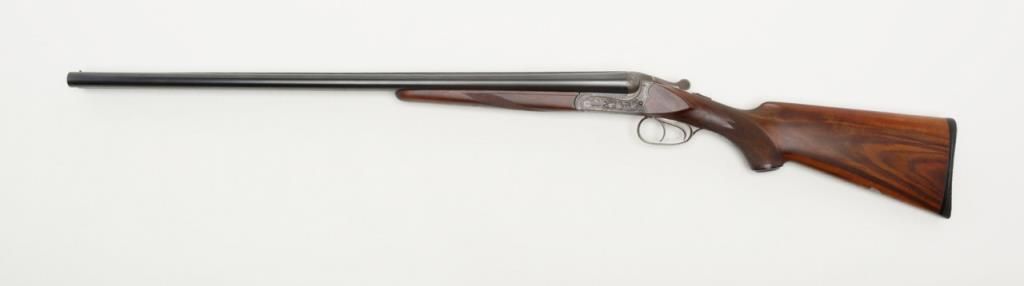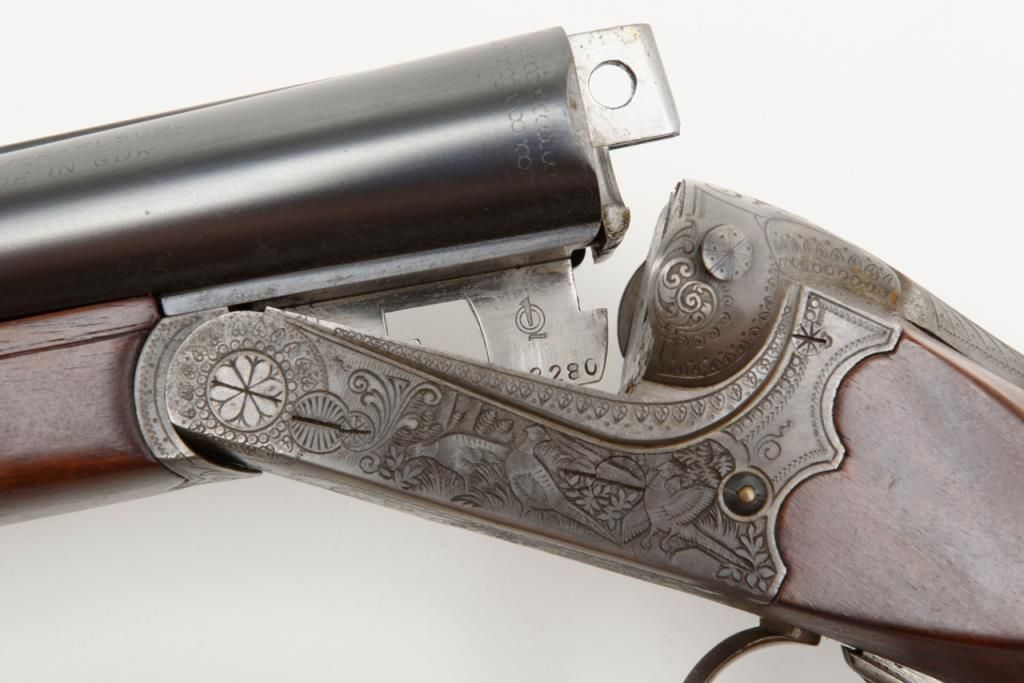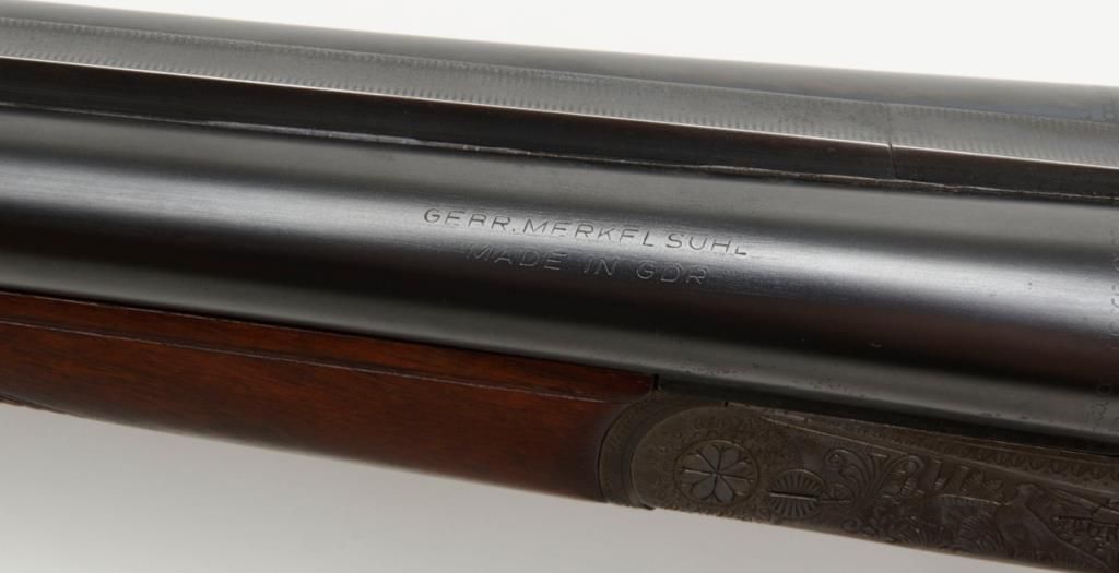 Merkel Field Grade side by side shotgun, cal. 12 gauge, Serial #NSNV. The shotgun is in overall fine condition with 28” blued barrels. The barrels retain nearly all of their blued finish with a full length filed rib, extractors and brass bead front sight. The finely checkered wood stocks are in fine condition also showing only slight marks consistent with storage, a blank silver escutcheon shield and hard rubber butt complete the stock. The action has gone to alight patina with traces of muted case coloring in protected areas. The scalloped action is finely engraved with games scenes on each side, one depicting ducks, the other with pheasants. The base of the action is further engraved, as are all screw heads and the Suhl trademark is incorporated into the motif. The bores are good and may well clean to very good. The guns action is tight and the markings remain crisp. (C+R/PPT). Est.: $1,400-$2,800.