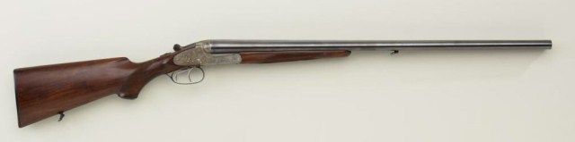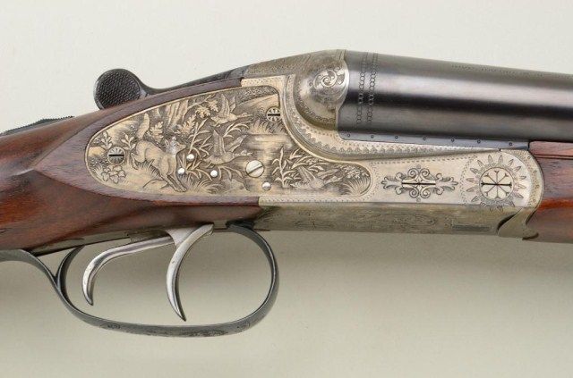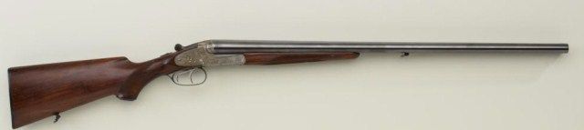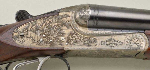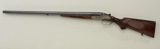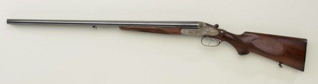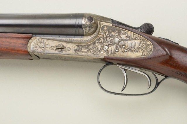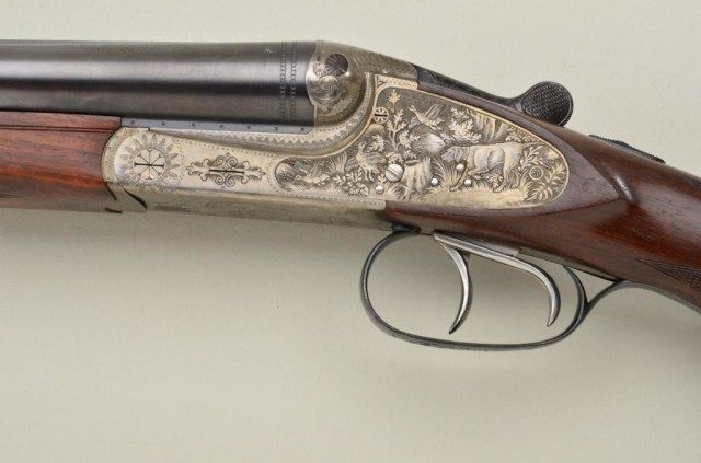 Merkel Model 96K SxS full side lock auto ejectors hammerless shotgun, 12 gauge, 28” barrels, full chokes, blue finish to barrels and fine panel scene engraving to receiver, double triggers, sling swivels, checkeredwood stocks, #780268. This gun is in overall fine condition showing the majority of its blue finish, engraving on receiver is beautifully accomplished showing game scenes on both sides, fine bores, crisp actions,fine checkered wood stocks with sling swivels; Suhl trademark is engraved on bottom of receiver in front of trigger guard and is also displayed on the checkered black hard rubber butt plate. Est.: $2,500-$5,000.