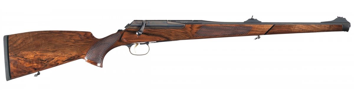 Red fiber optic front ramp sight and three dot yellow fiber optic fixed rear sight. The top of the barrel has notches for scope mounting. There is a casehardened bolt cover that slides on rails along with the bolt. Mounted on a nicely figured walnut pistol grip stock with forearm cap, contrasting wood strip, fish scale checkering, sling swivels, hogsback comb, Bavarian raised cheekpiece and solid recoil pad. With original box numbered to gun, quick detachable scope mount and manual.