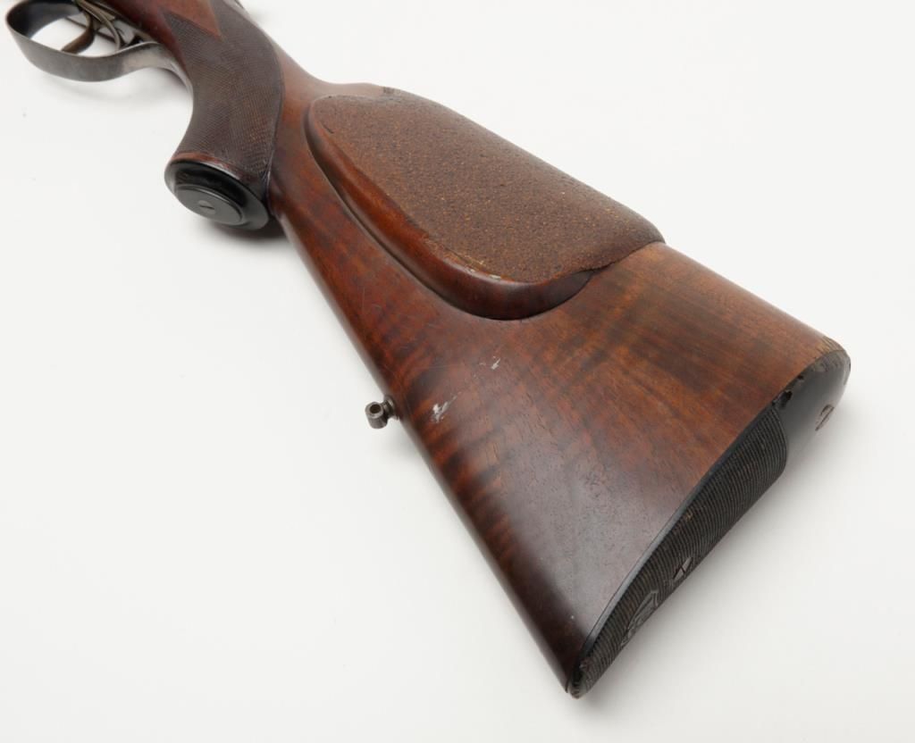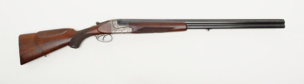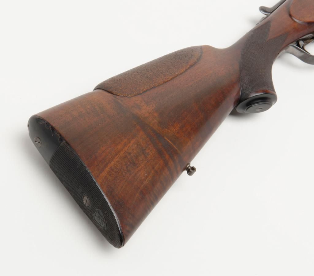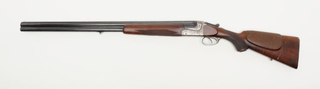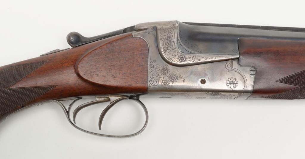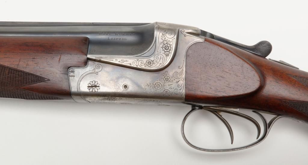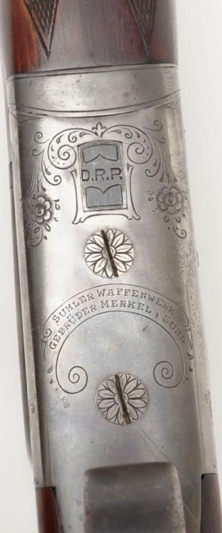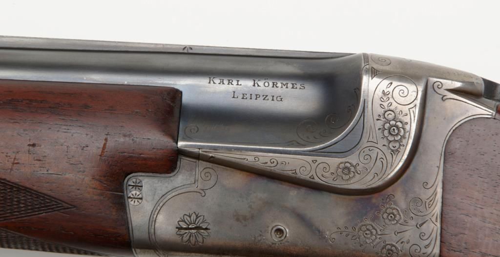 Merkel Pre-War O/U shotgun, cal. 20 gauge, Serial #3982. The shotgun is in overall very good to nearly fine condition, with 28” blued barrels, marked “Karl Kormes, Leipzig.” The gun retains nearly all of its blued finish with a full lengthfiled rib and ivory bead front sight. The action is tastefully engraved, as are all the screw heads and the action shows a significant amount of case color. The finely checkered wood stocks are in overall very good condition with some surface mars and small paint transfer to the buttstock. The cheek piece has been textured and a horn grip cap and butt plate added. The bores are very good and may clean, the action is tight and all markings are crisp. The underside of the action is marked,“Gebruder Merkel, Suhl”. A beautiful, pre-war Merkel. (C+R/PPT). Est.: $1,500-$3,000.