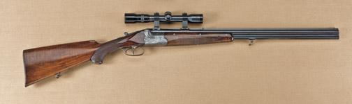Merkel combination cape gun, 16ga (choked Extra Full) over 8x57mm rimmed. Barrels marked on left side of breech “GG Almendinger, Goppingen” agents. Serial #18511 showing prewar German proofs. The gun measures 43-1/2” overall with 26-1/2” barrels Is nicely stocked in select walnut with good checkering. The gun is equipped with a Helia 2.3 to 7 power scope on later Zeiss claw mounts which are fitted to this arm. The action is lightly scroll engraving, cocking indicators, set trigger on rifle barrel, classic German styling mounted with sling swivels, horn buttplate. The gun shows approx. 80-90% original blue evenly thinning and toning, slight losses, a few nicks at the edges, 40-60% toning case hardening, very good plus wood stocks showing just some slight wear to the checkering on the forend. The action is tight, the barrels are fine to excellent, and the gun show selective ejectors. Est: $2,500 - $5,000