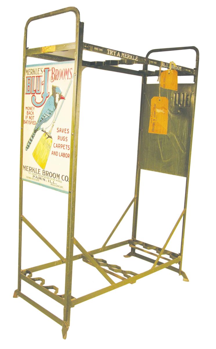 Merkle's Blu-J Broom Store Display. Merkle Broom Co. Paris, IL. Embossed tin panels on pressed steel rack. Two ink blotters included. Some minor scratches and flaking to one side and tiny paint chips to other, otherwise very good condition. 23 X 34 3/4 X 10 1/2 inches.