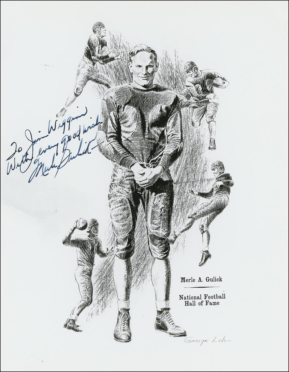 College Football Hall of Famer (1906–1976). Glossy 7.75 x 10 composite photo showing five artist renderings, signed and inscribed in fountain pen “To Jim Wiggins, With every good wish, Merle Gulick.” In fine condition with a couple of dings and lightly trimmed edges.