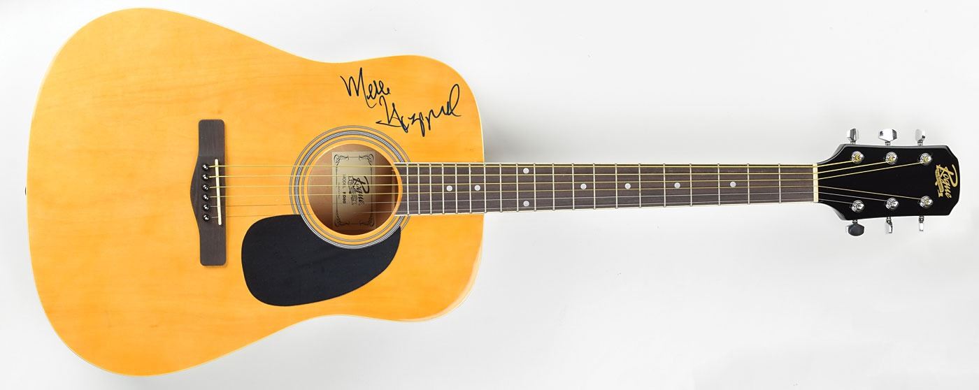 Classic natural-finish Rogue acoustic guitar signed on the body in blue felt tip by country music legend Merle Haggard. In fine condition.