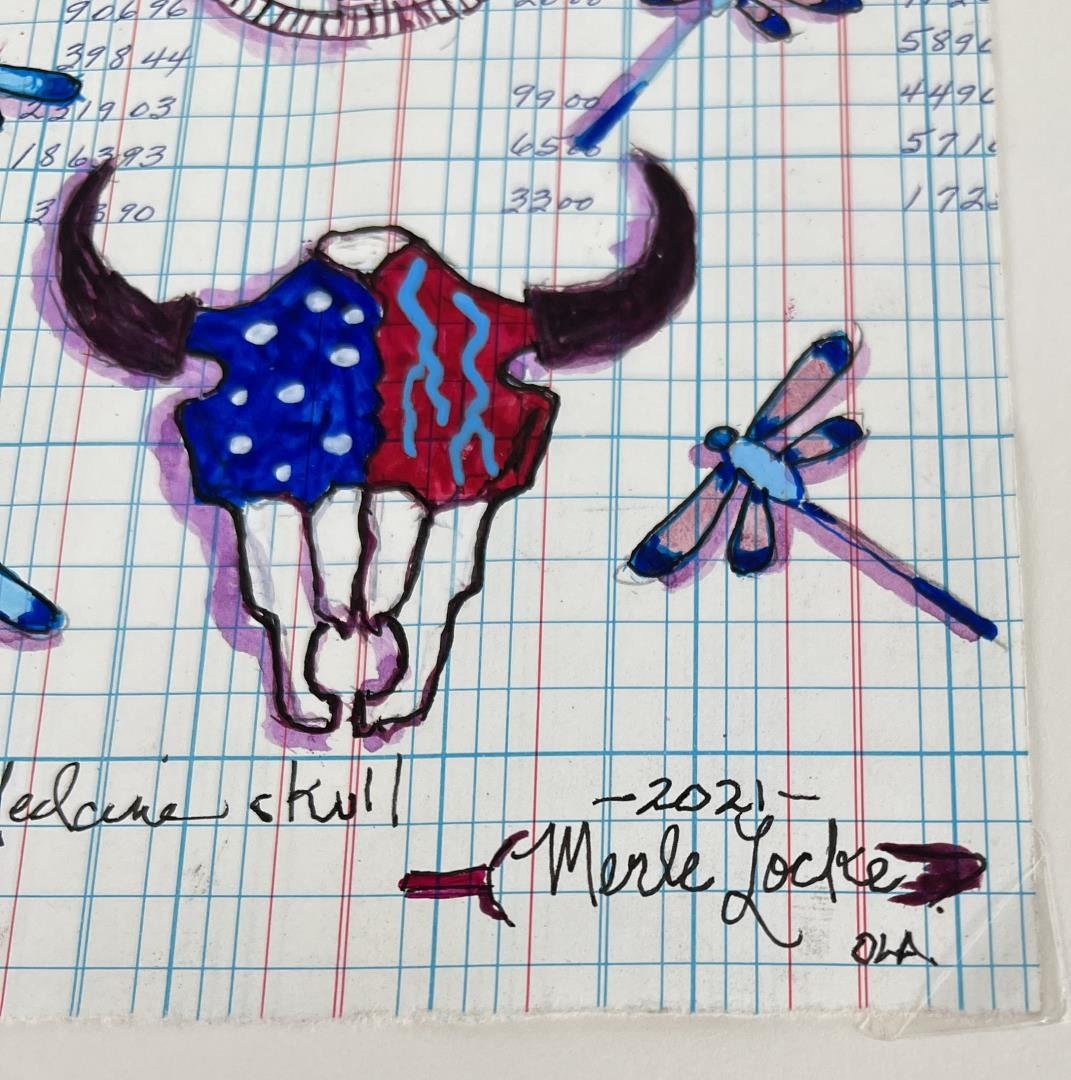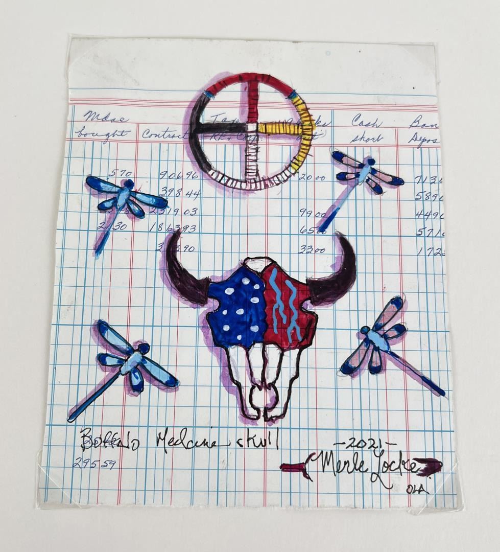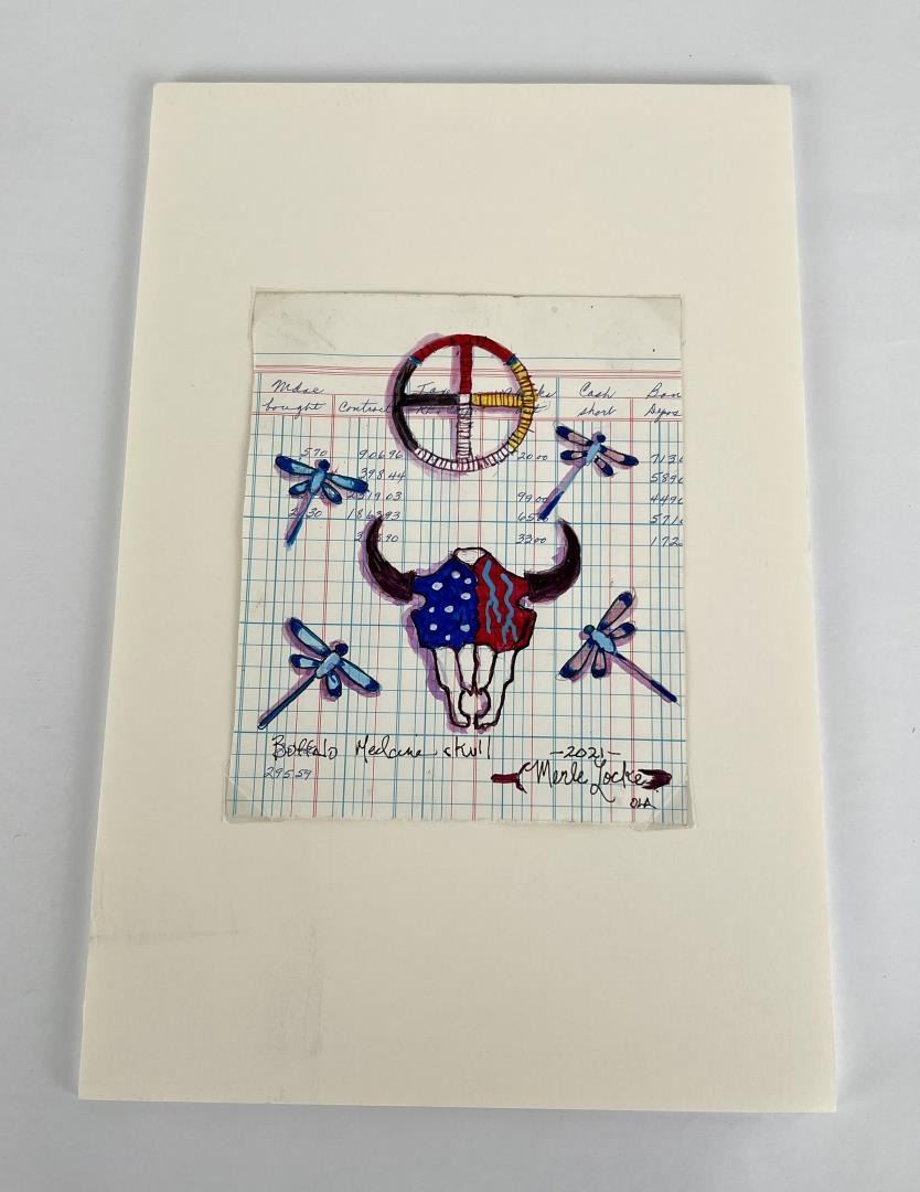 Painted on antique ledger. Title is "Buffalo Medicine Skull". Artist is Merle Locke. 5" by 6".