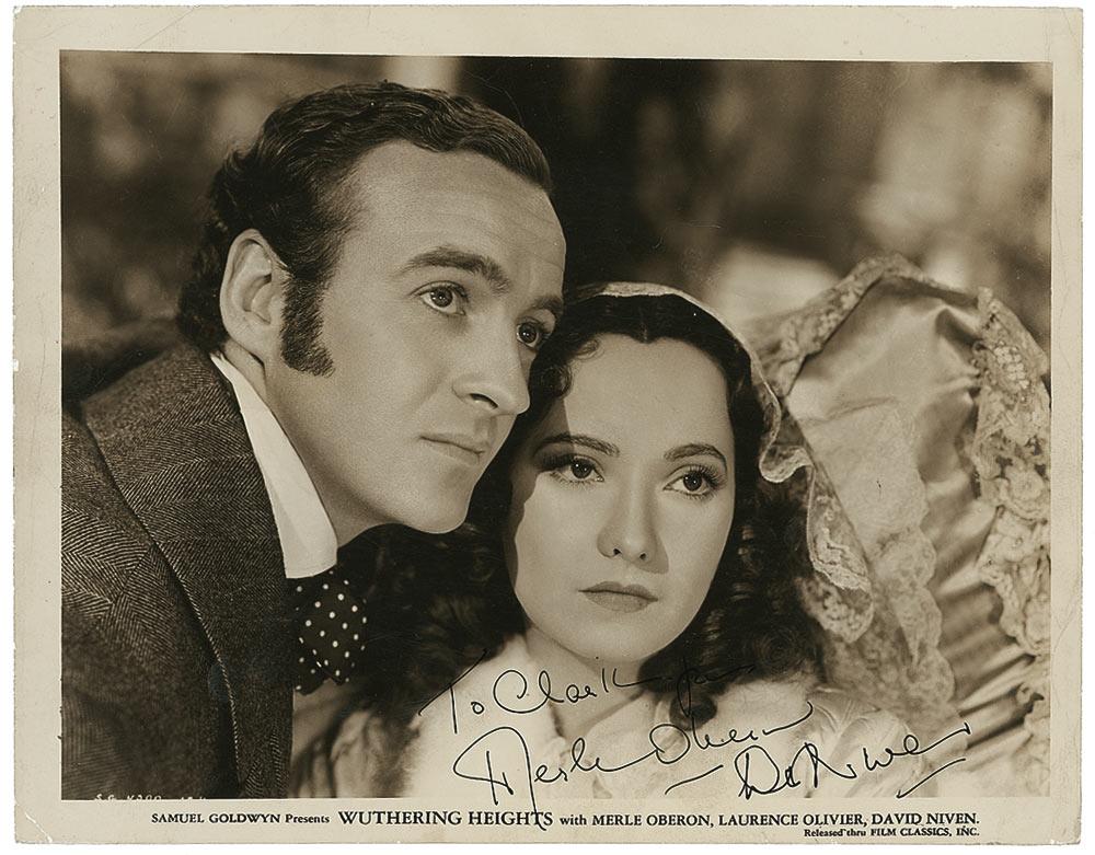 Vintage glossy 10 x 8 Samuel Goldwyn promotional photo for Wuthering Heights, signed and inscribed in black ink “To Clark, Merle Oberon,” and “David Niven.” In very good condition, with scattered creases and surface marks. Pre-certified PSA/DNA and RRAuction COA.