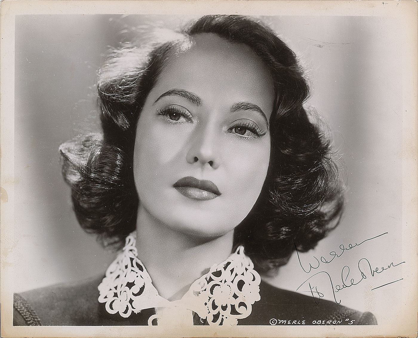 Vintage glossy 10 x 8.25 publicity photo of Oberon in a beautiful close-up pose, signed and inscribed in fountain pen, "Warren, Merle Oberon.” In fine condition, with some light toning in the borders.