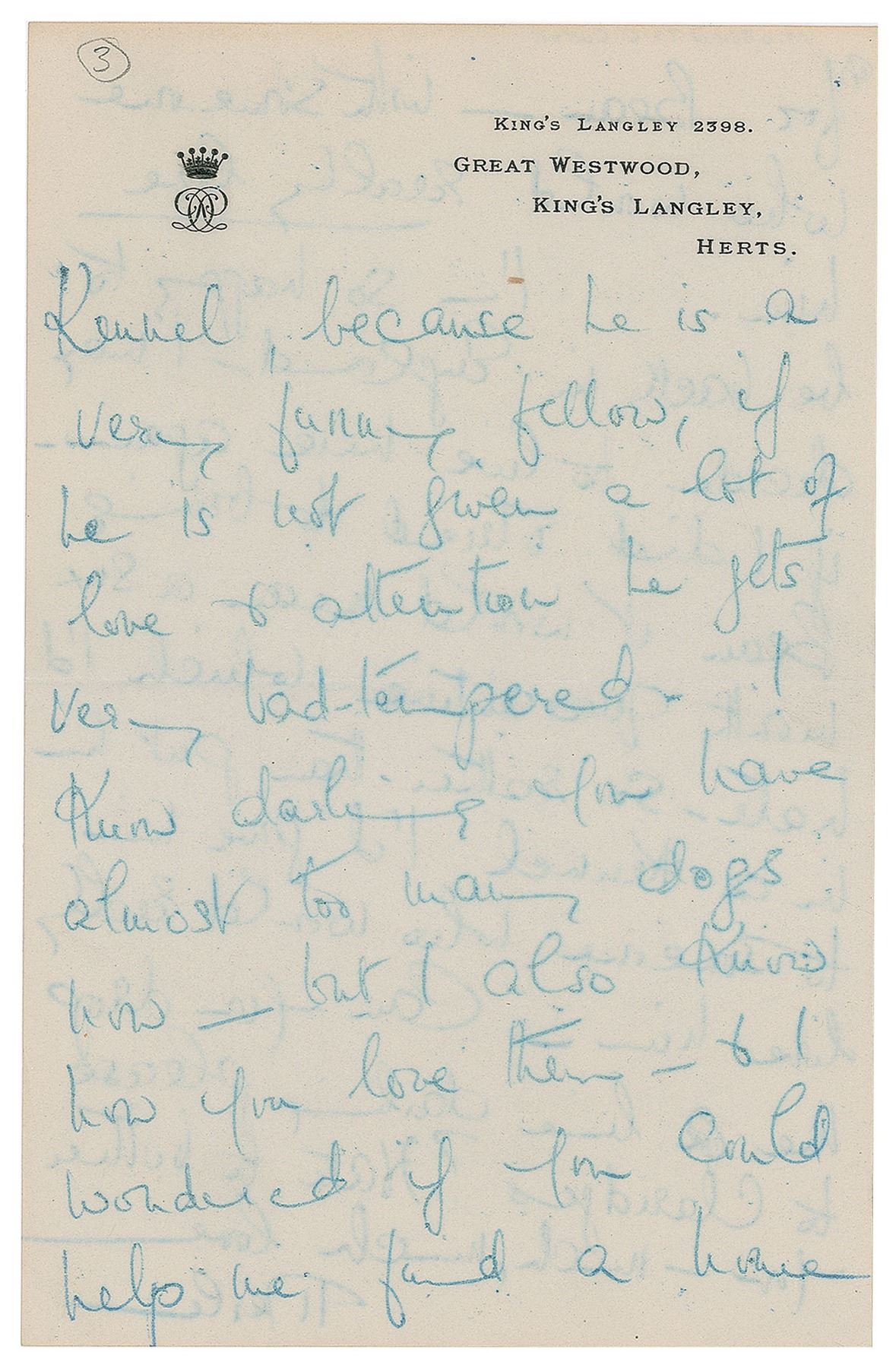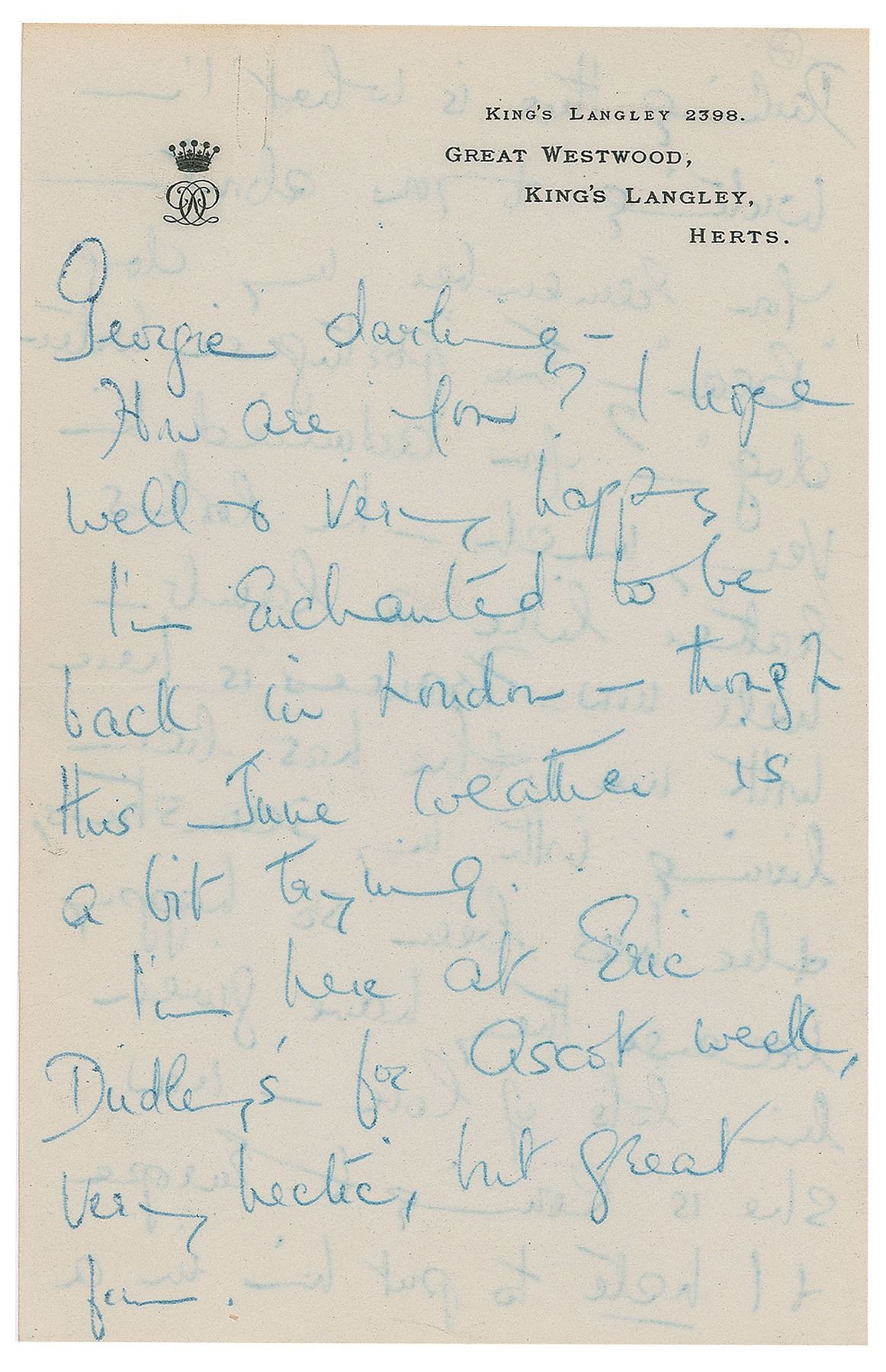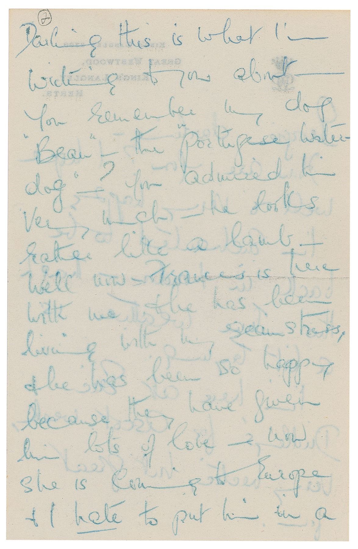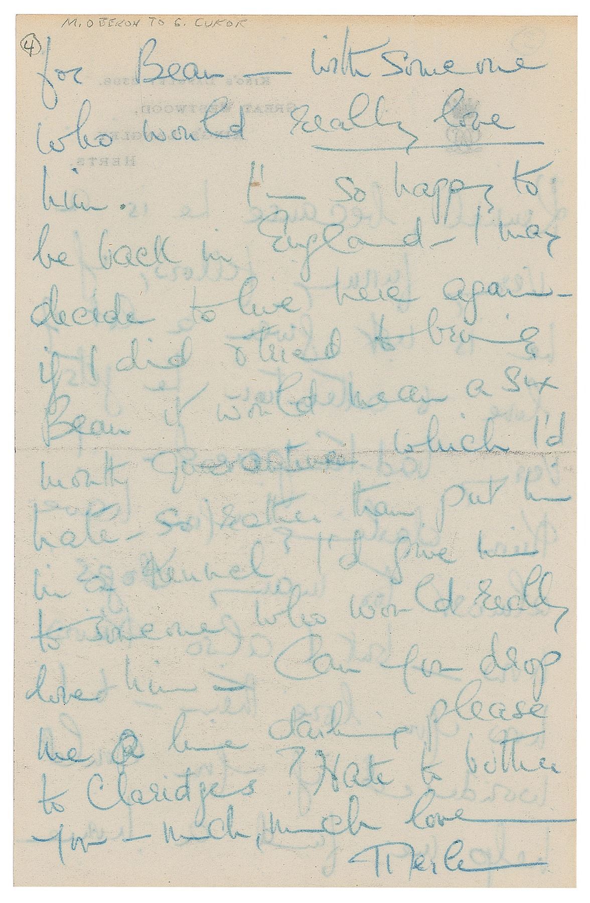 ALS signed “Merle,” four pages on two sheets, 4.5 x 7, Great Westwood, King's Langley letterhead, no date. Letter to director George Cukor, in part: "I'm enchanted to be back in London—though this June weather is a bit trying. I'm here at Eric Dudley's for ascot week, very hectic, but great fun. Darling, this is what I'm writing to you about—you remember my dog 'Beau'—the Portuguese water dog—? You admired him very much—he looks like a lamb. Well now Frances is here with us & he has been living with my seamstress & he has been so happy because they have given him lots of love—now she is coming to Europe & I hate to put him in a kennel, because he is a very funny fellow, if he is not given a lot of love & attention he gets very bad-tempered…I wondered if you could help me find a home for Beau—with someone who would really love him." In fine condition.
