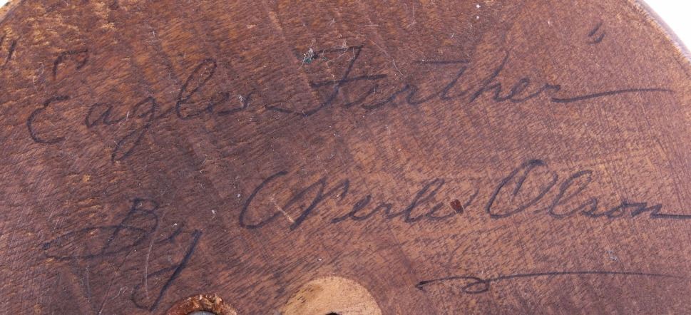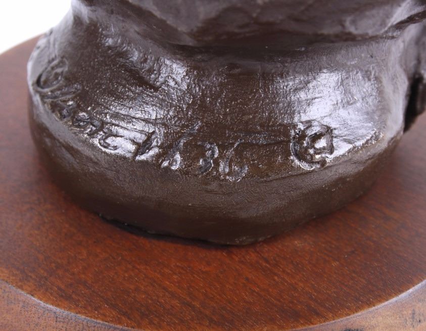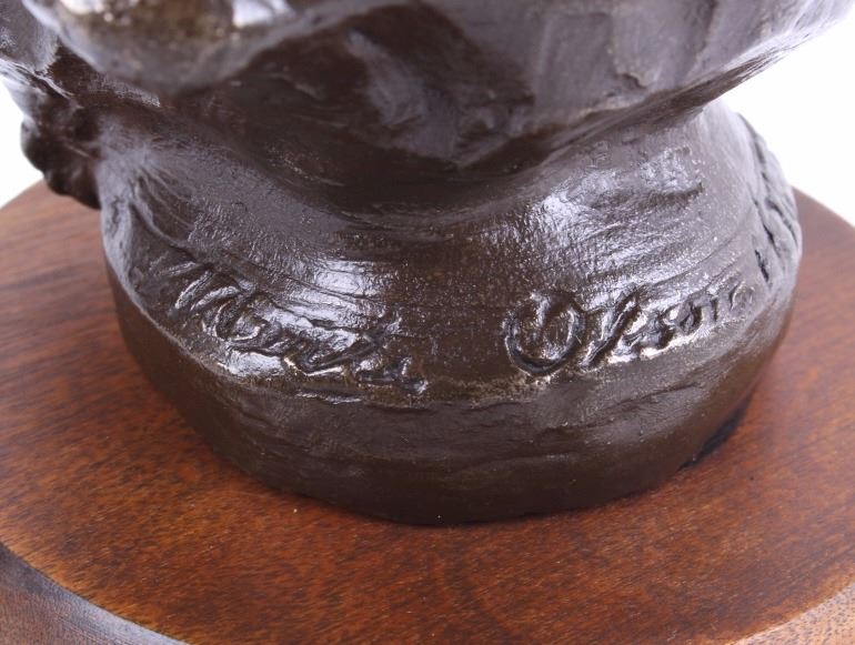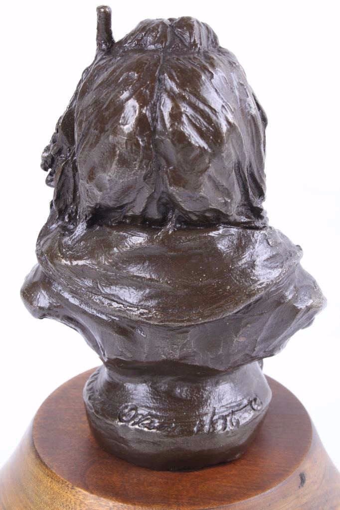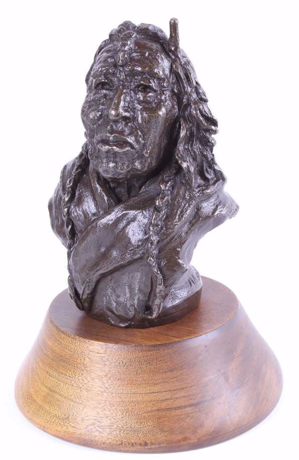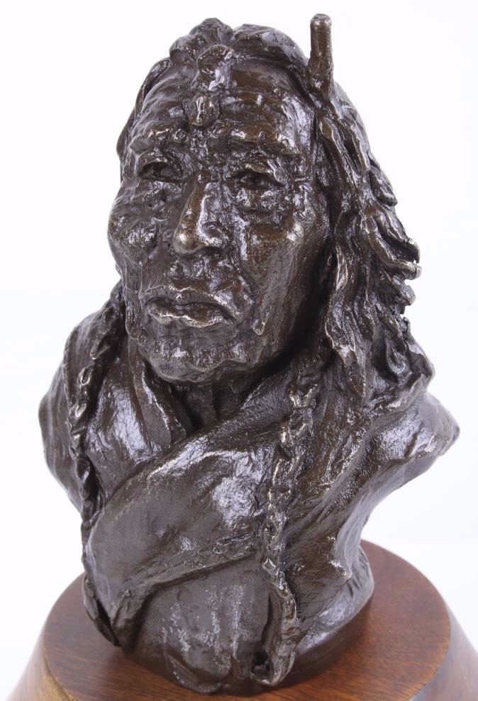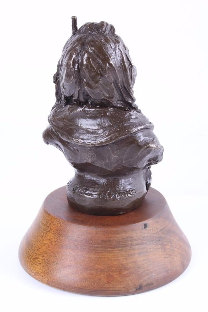 This lot is a bronze sculpture by the artist Merle Olson called "Eagle Feather". Merle Fisk Olson (1910-1999) spent a lot of time in Arizona, worked in Salt Lake and in 1970 opened a foundry in Big Fork, MT. where she cast her bronzes. The piece is titled "Eagle Feather" and shows a Native American man with long braided hair. The piece is set on a polished wood base. The artist employs an impressionist style in her technique. The piece is signed "Merle Olson 1/36." The piece is in good condition. It measures 5 5/8" D x 7" H