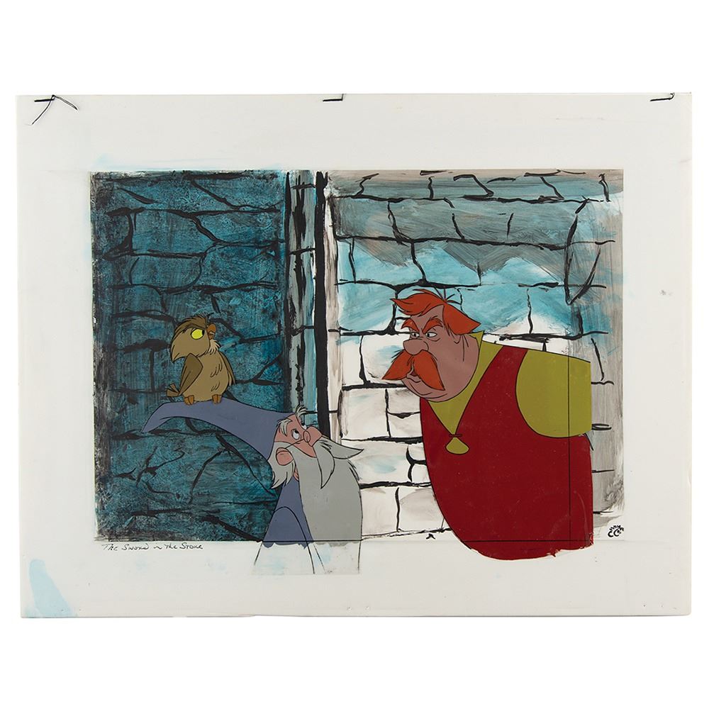 (Walt Disney Studios, 1963) Original production cels of Merlin, Archimedes, and Sir Ector from The Sword in the Stone, which depicts Merlin and his pet owl during a conversation with the large Sir Ector. The cels have been trimmed and applied to a hand-painted watercolor custom-prepared background. Character images measure 6 x 7 (Merlin and Archimedes) and 5.5 x 7.5 (Ector), with overall dimensions of 18 x 14. Reverse of background bears two Walt Disney Productions labels. In fine condition, with pin holes to background borders.