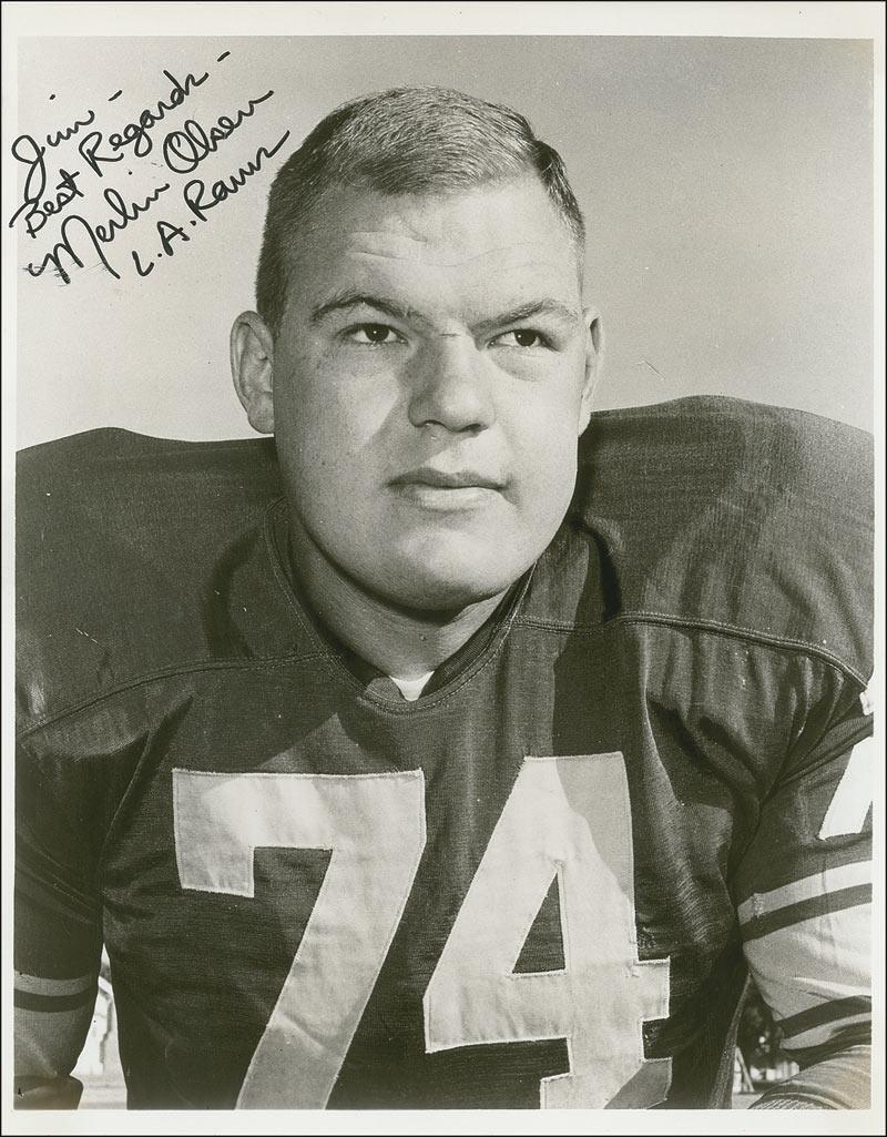 Vintage glossy 8 x 10 close-up photo of Olsen in his playing days, signed and inscribed in black felt tip “Jim—Best Regards—Merlin Olsen, L.A. Rams.” In very good condition, with vertical crease crossing his face and body and a few scattered bends.