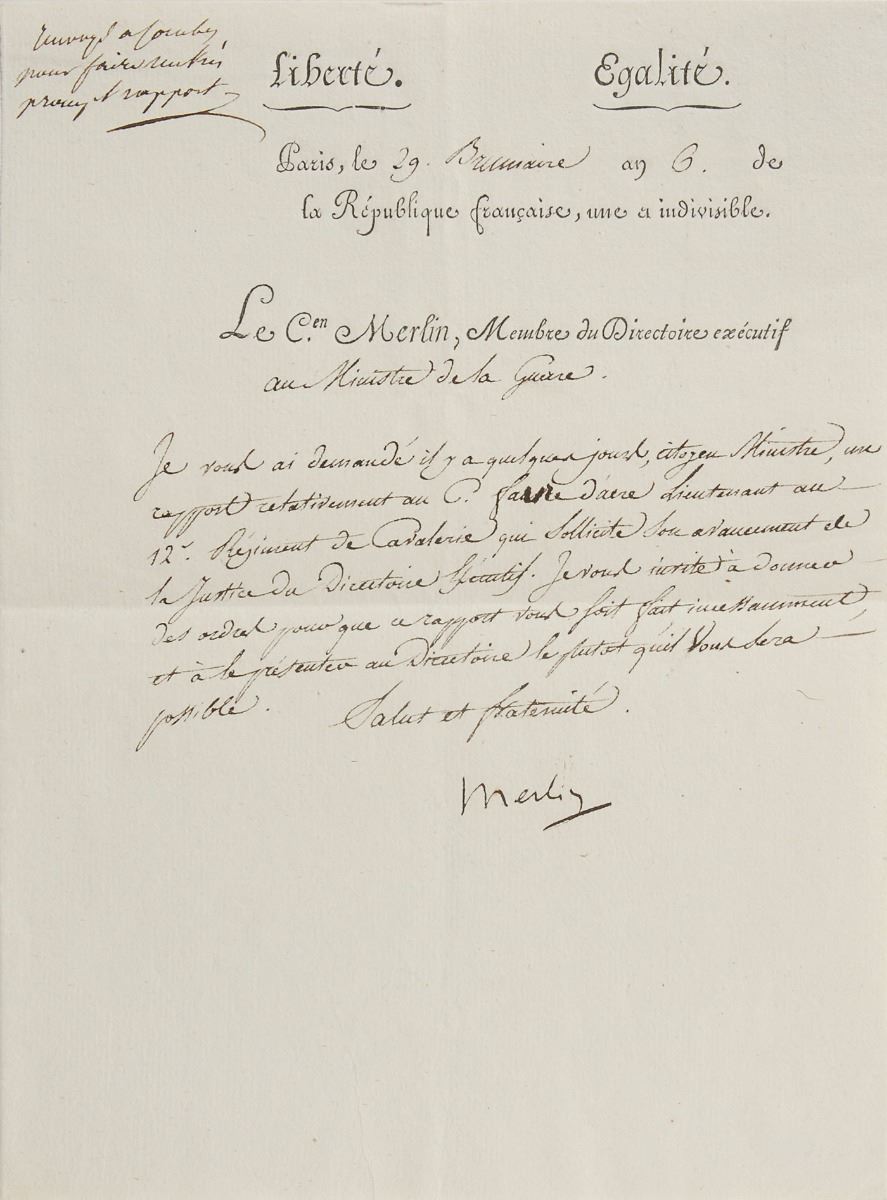Politician and lawyer (1754–1838) of the French Revolution. Untranslated LS in French, signed “Merlin,” one page, 7.5 x 9.5, November 19, 1797. In fine condition.