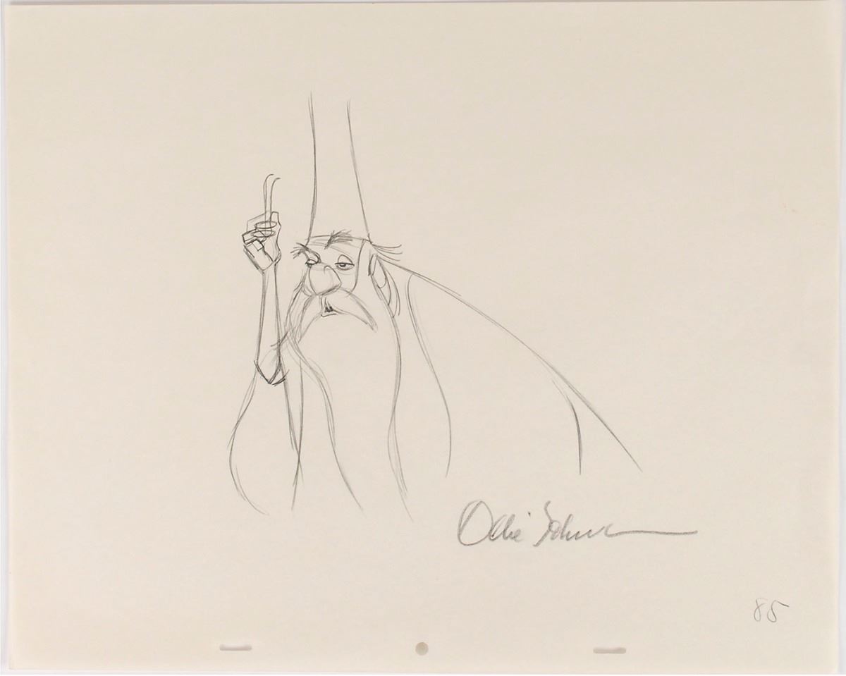 (Walt Disney Studios, 1963) Original production drawing by famed animator Ollie Johnston featuring Merlin from The Sword in the Stone, signed below in pencil by Johnston. Accomplished in graphite on untrimmed 15.5 x 12.5 animation paper. Image measures 8 x 8. In fine condition.