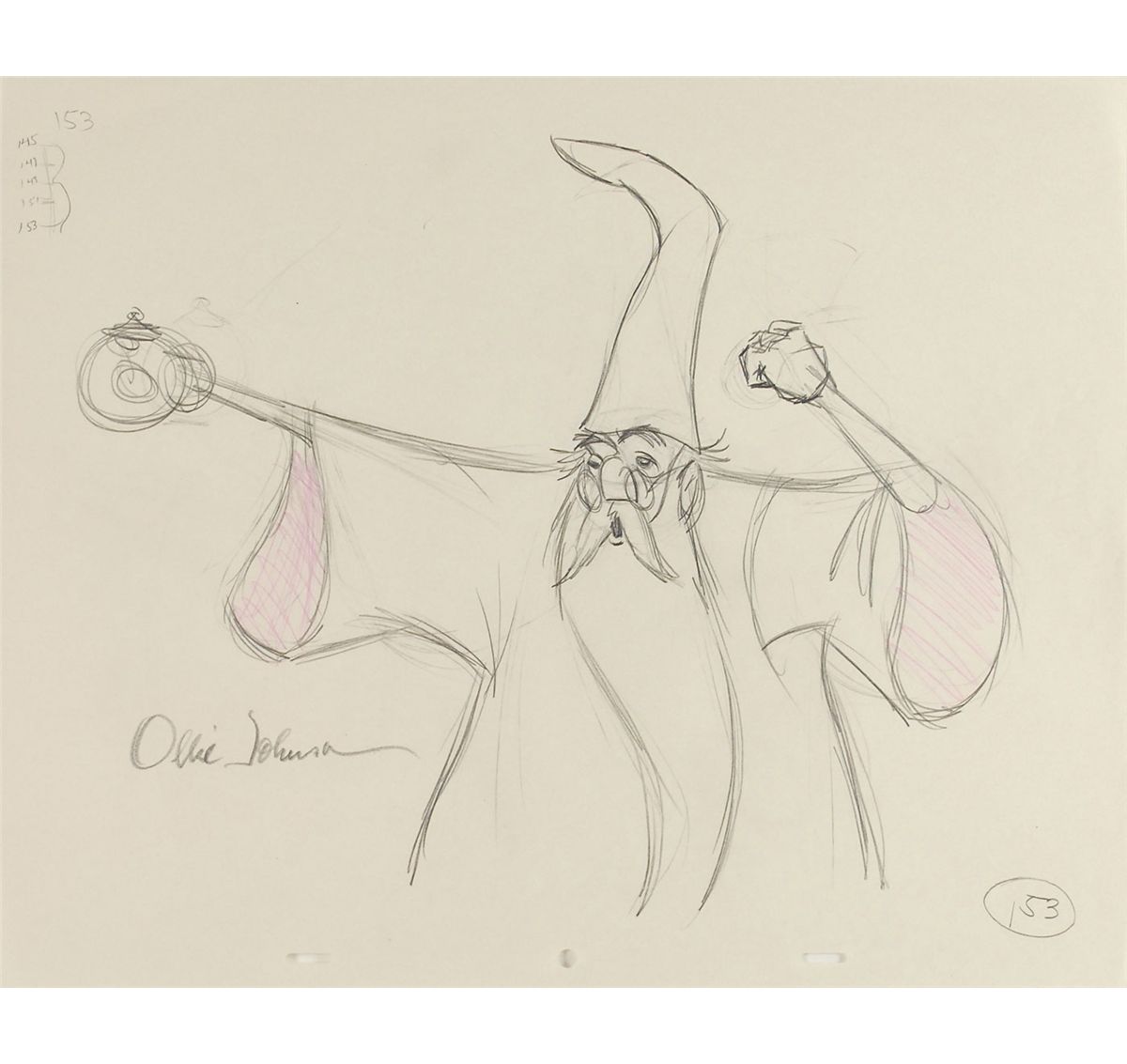 (Walt Disney Studios, 1963) Original ‘rough’ production drawing featuring Merlin the Magician from The Sword and the Stone. Accomplished in red pencil and graphite on untrimmed 15.5 x 12.5 animation paper and shows Merlin gesturing with both hands. Image measures 13 x 11.5, and is signed in pencil by famed Disney animator Ollie Johnston. In fine condition.