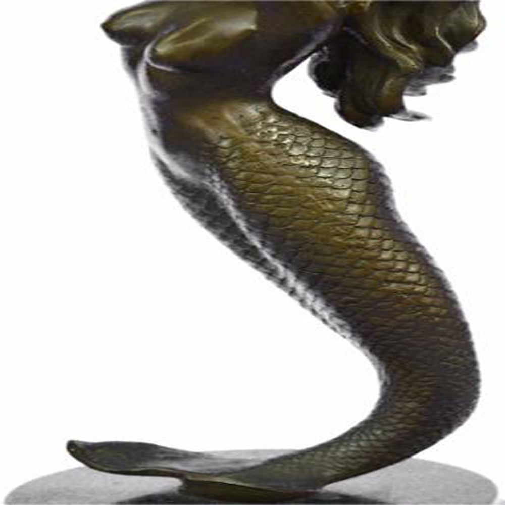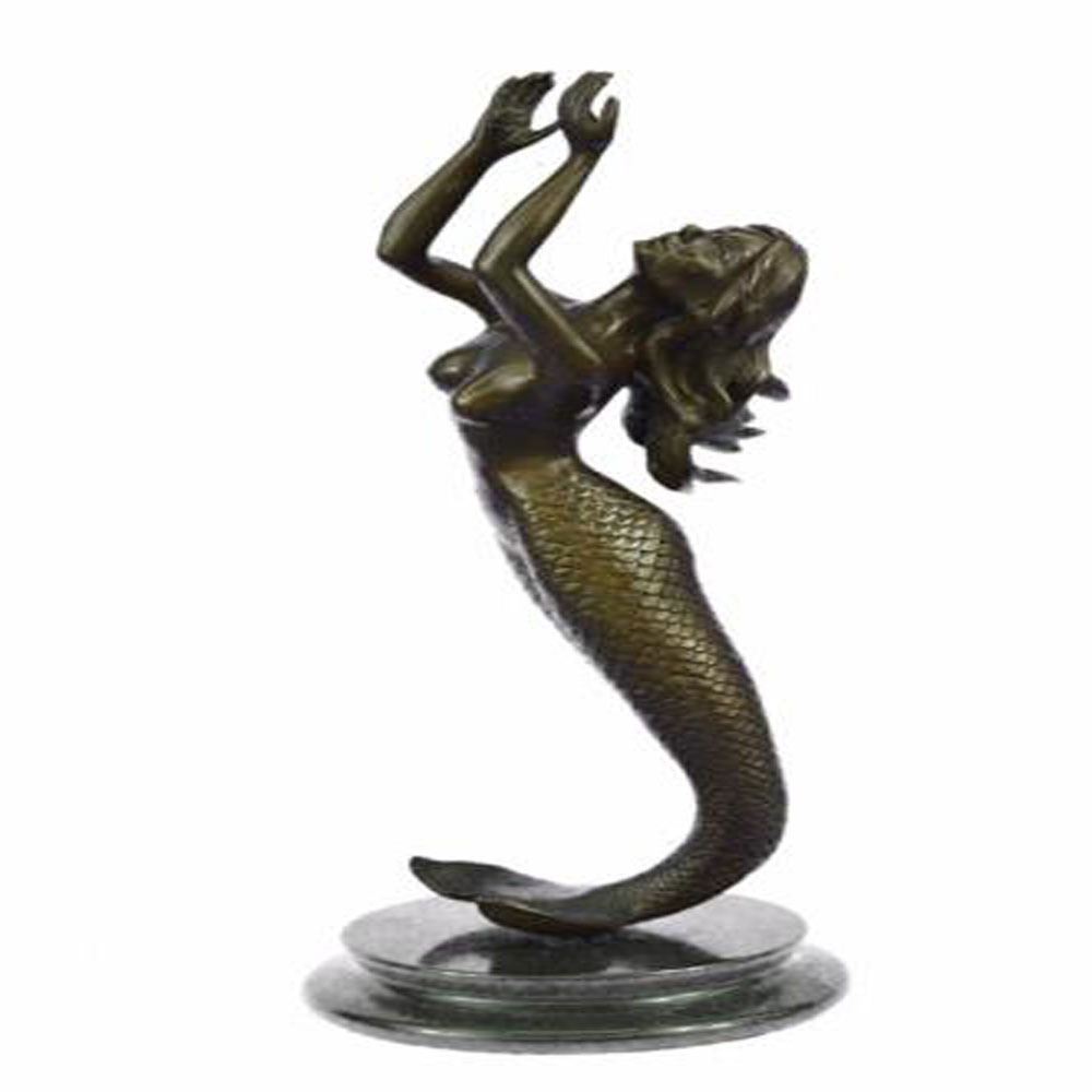 The beautiful mermaid can be imagined, holding herself up with her fishtail, among the body of the ocean of her water kingdom. Her arms are raised and cupped as her hair flows backwards taken by the movement of water currents. The handmade Bronze Sculpture awakens in the viewer, the mystery and beauty in the unknown, reviving the mysticism of the ageless tales of folklore. It was cast using the archaic method of lost wax casting and stained with a brown patina stain for perpetuation and is mounted upon a marble base. Dimensions: Height 15 X Width 6 inches. Weight: 8 LBS.