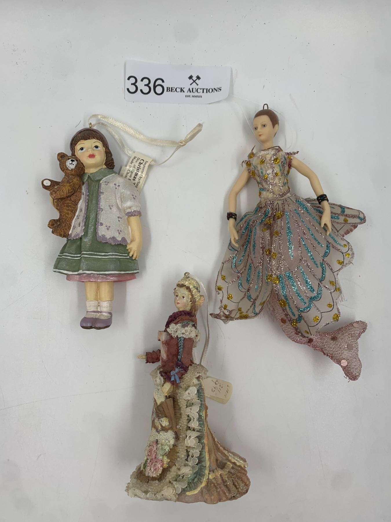 Mermaid Ornament, Victorian Lady Ornament, and Girl with Bear Ornament