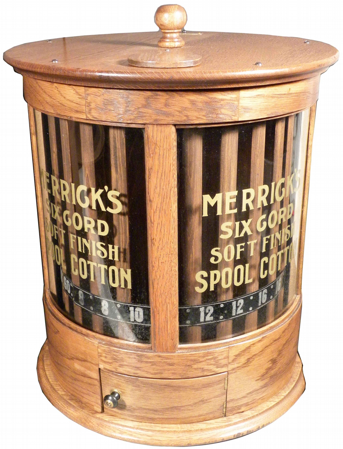 Merrick's Six Cord Round Spool Cabinet. Six Cord Soft Finish Spool Cotton. Excellent original condition. 17 1/2 inch diameter X 23 inches tall.