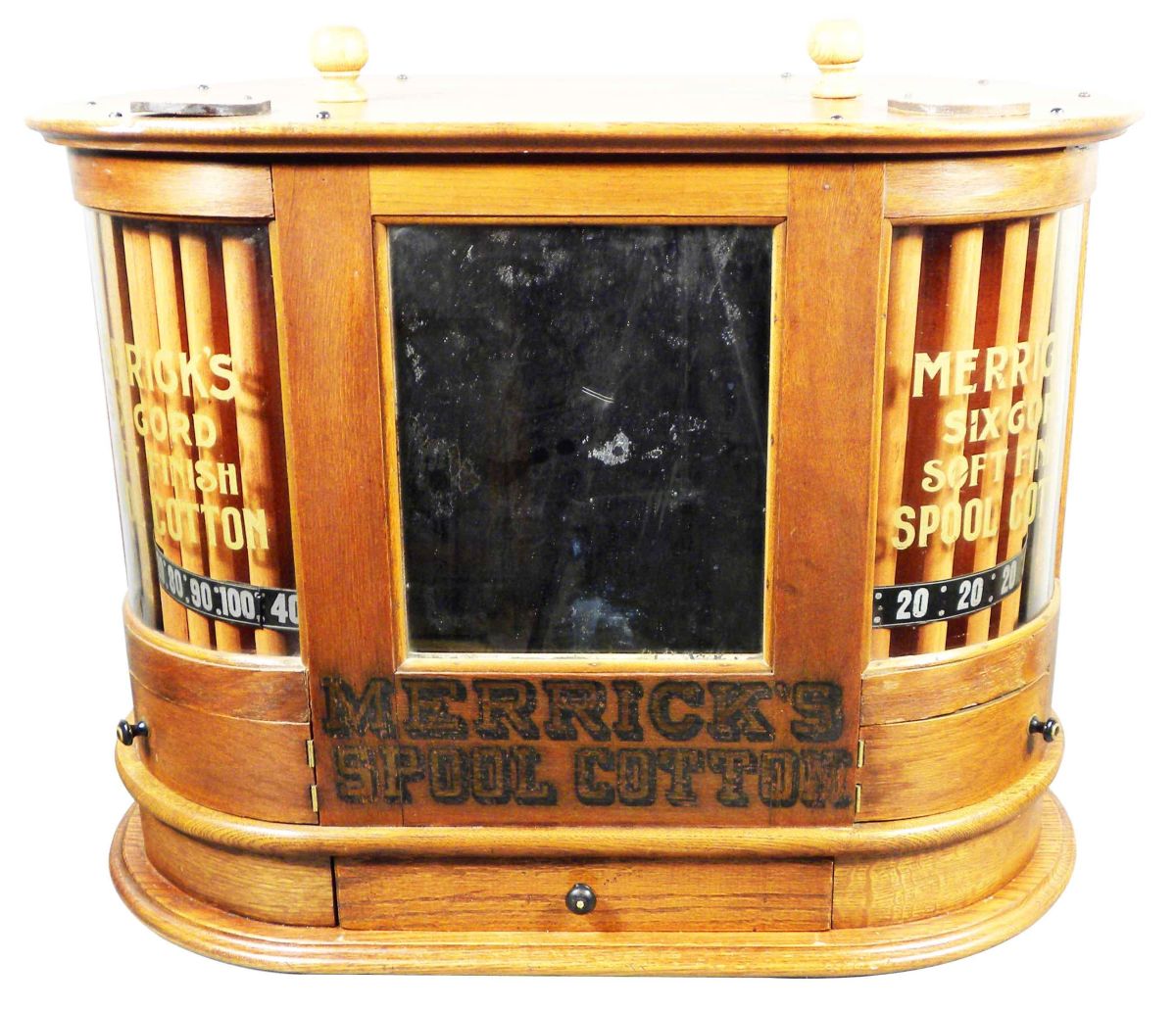 Merricks Double Spool Cotton Cabinet. Oak with curved glass at both ends. Very good original condition. 31 X 22 1/2 X 17 inches.