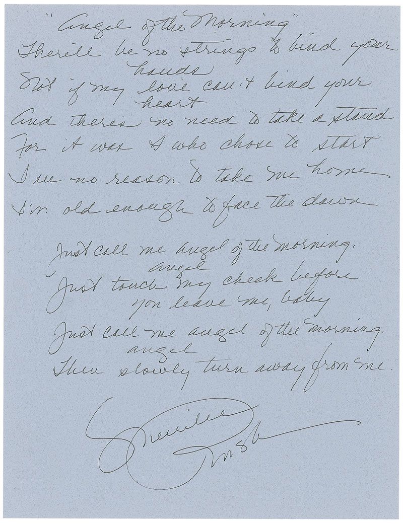 Handwritten souvenir lyrics to ‘Angel of the Morning’ on a light blue 8.5 x 11 sheet, signed floridly at the conclusion. In fine condition.