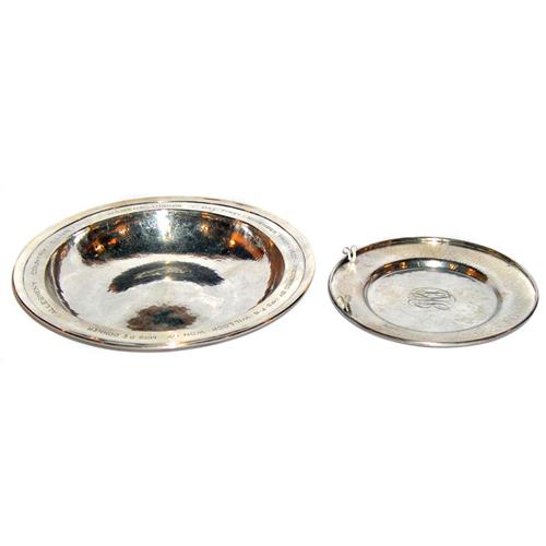 Merrill Shops bowl, hammered sterling, 8.75"dia.; with a Merrill Shops plate, (not shown) hammered sterling, engraved monogram, 6"dia.; with a Merrill Shops bowl, (not shown), 1920 Country Club presentation, engraved, hammered silver, 8.5"dia., all marked