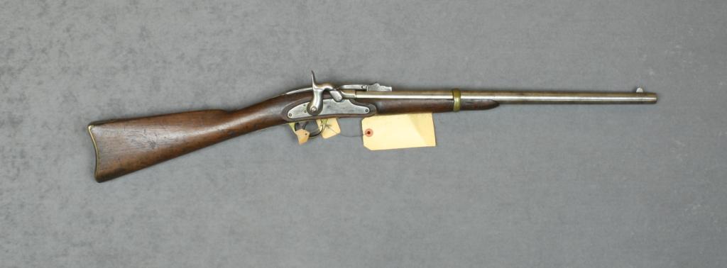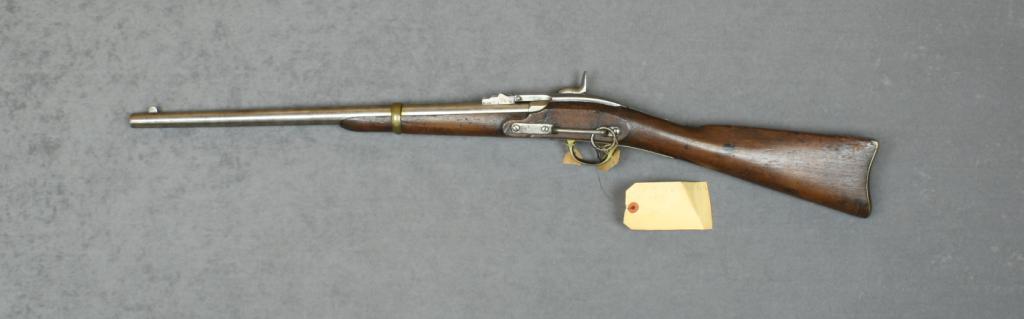 Merrill percussion SRC, .54 cal., 22” round barrel, breech accessed via pulling release and raising up top breech lever, brass barrel band, trigger guard and butt plate, wood stock, #16175. This gun is in overall verygood condition showing a light grey patina with scattered pin prick pitting and a couple spots of erosion, very good bore, crisp action, visible markings, “US” marking on top of butt plate; wood is overall good to verygood with some scattered nicks and mars and a couple old spots of discolor, “US” cartouche on left side of stock under the saddle ring bar; second type (no patchbox). Approx. 14,500 were manufactured. Est.:$900-$1,800.