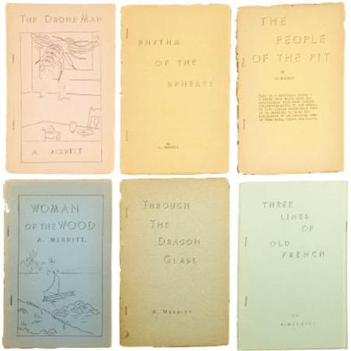 <B>A[braham]. Merritt. Six Unauthorized Short Stories Published by Doreal</B></I>. [N.p., n.d., but Sedalia, Colorado: M. Doreal, 1948.] Includes: "The People of the Pit", "Rhythm of the Spheres", "The Drone Man", "Woman of the Wood", "Three Lines of Old French", "Through the Dragon Glass".<BR><BR>First editions. Six octavo volumes. <BR><BR>Plain wrappers with black titles. Stapled. Mimeographed text. All volumes toned throughout the textblock, with minor to moderate chipping around the wrappers, else a very good set. These stories were later collected in <I>The Fox Woman & Other Stories</B></I>. The publisher bound some sets of these stories together in a single volume. (Sam Moskowitz, <I>A. Merritt: Reflections in the Moon Pool</B></I> 157-158) <I>From the Robert and Diane Yaspan Collection.</B></I><BR><BR><b>Shipping:</b> Books & Catalogs (<a target="_blank" href="http://www.heritageauctions.com/common/shipping.php">view shipping information</a>)