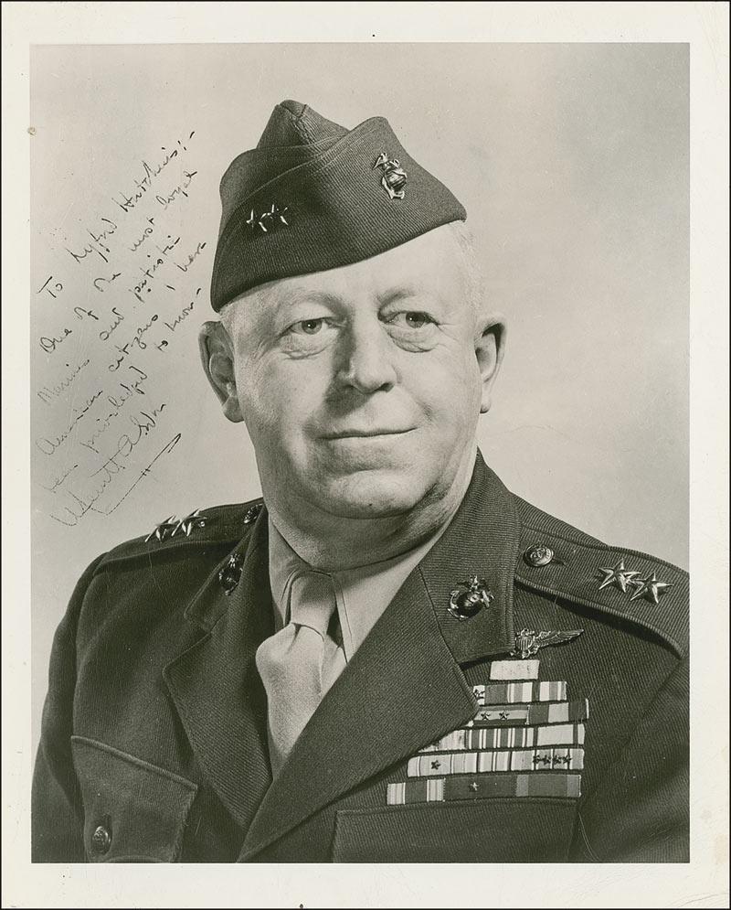 US Marine Corps general (1897–1955) who was awared the Medal of Honor, two Navy Crosses, the Silver Star, and two Legions of Merit. He is best known by Marines for the defense of Lunga Ridge during the Guadalcanal Campaign in World War II. He committed suicide in 1955 while serving as Executive Director of the NRA. Vintage glossy 8 x 10 cardstock photo of Edson in military dress, signed and inscribed in fountain pen “To Lyford Hutchins—One of the most loyal Marines and patriotic American citizens I have been privileged to know. Merritt Edson.” In very good condition, with moderate crazing to the emulsion, several vertical creases with some through the signatuare, a couple of surface scratches, and staining to the lower right corner. This is the only signed photo of Edson we have ever offered.