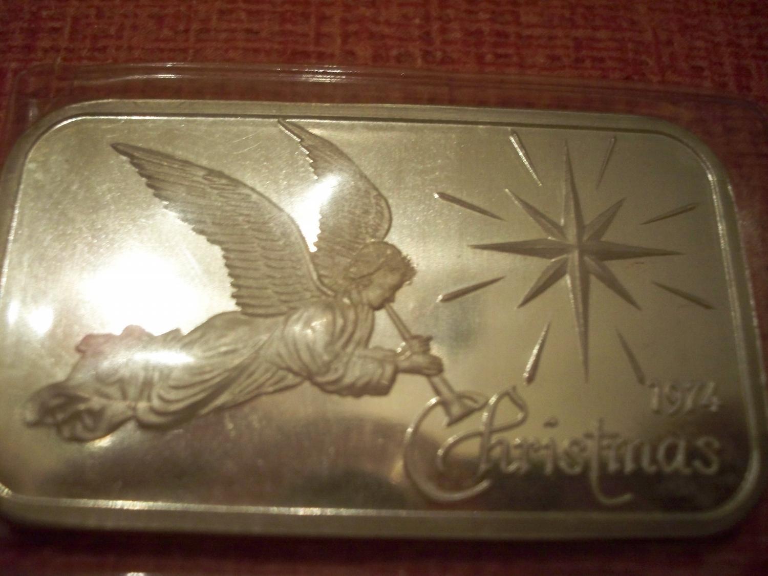 This 1974 commemorative ounce of .999 pure silver from the madison mint depicts the Christmas angel trumpeting below the North star. - Merry Christmas