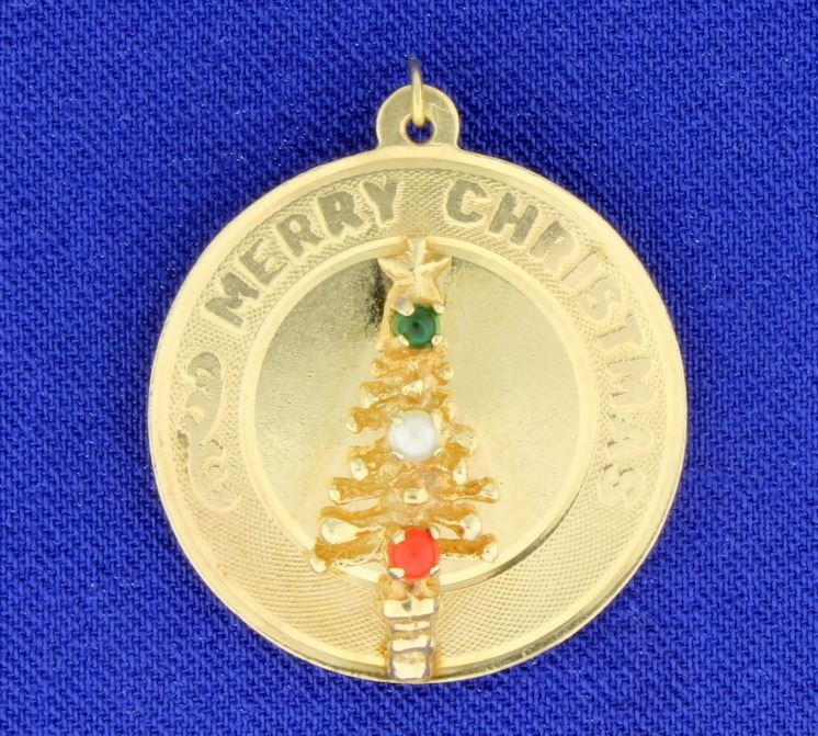 The charm is 14K yellow gold and is 1 1/4 inches long. It contains a 2mm emerald, ruby, and pearl on Merry Christmas Side. 4.4g