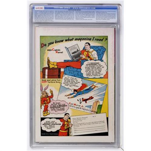 <B>Merry Comics #nn Vancouver pedigree (Carlton Publishing, 1945) CGC NM 9.4 White pages.</B></I> Ridiculously nice condition and page quality make this one to grab. This oddball one-shot is the only comic we can think of that has the cover price at the bottom. A Gerber "7," it's published by Carlton -- not to be confused with Charlton. It has a story featuring Bogeyman, whom we know from Enwil's <B>Red Band Comics</B></I>. Overstreet 2007 NM- 9.2 value = $245. CGC census 6/07: 1 in 9.4, 1 higher.<BR><BR><b>Shipping:</b> Comics - Slabbed (certified) (<a target="_blank" href="http://www.heritageauctions.com/common/shipping.php">view shipping information</a>)