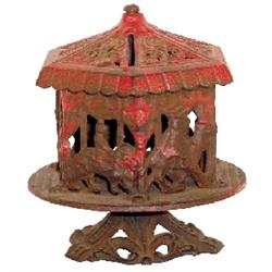 Merry-Go-Round cast iron bank, revolves on fancy base, has original red & gold paint & original clos