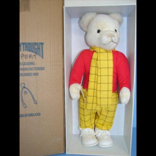 Merry Thought Bear Original Packing Box Design #1221 Tag on Hand Rupert Ay18ID Red Shirt Yellow pants. 18" Tall. Weight 4 lb.