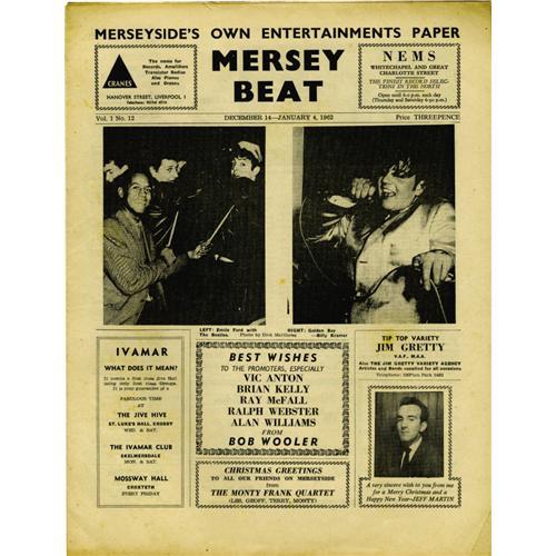 <B>"Mersey Beat" #12.</B></I> Although "Mersey Beat" featured great writing on the local Merseyside music scene, the advertising in this issue cover dated December 14, 1961-January 4, 1962, is of particular note. The front page features a small ad for NEMS Music Store, owned by the family of Brian Epstein, who would eventually write a column for "Mersey Beat" and -- more importantly -- become the manager of the Beatles. The back of the eight-page tabloid features a full-page ad for The Cavern touting performances by the Beatles, Gerry and the Pacemakers, and others. In Very Fine condition with light wear and mild tanning. These back issues are ultra rare in the U. K., even rarer here in the States.