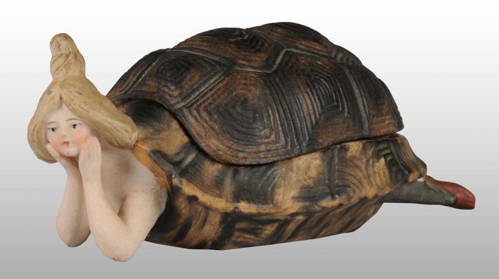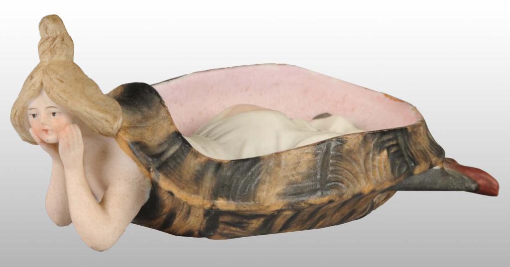 Description American, early 1900s. Bisque porcelain depiction of blonde female in a turtle shell, which opens to depict her bare fanny. Condition (Excellent). Size 4 - 1/2" L.